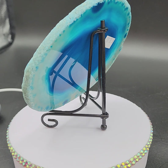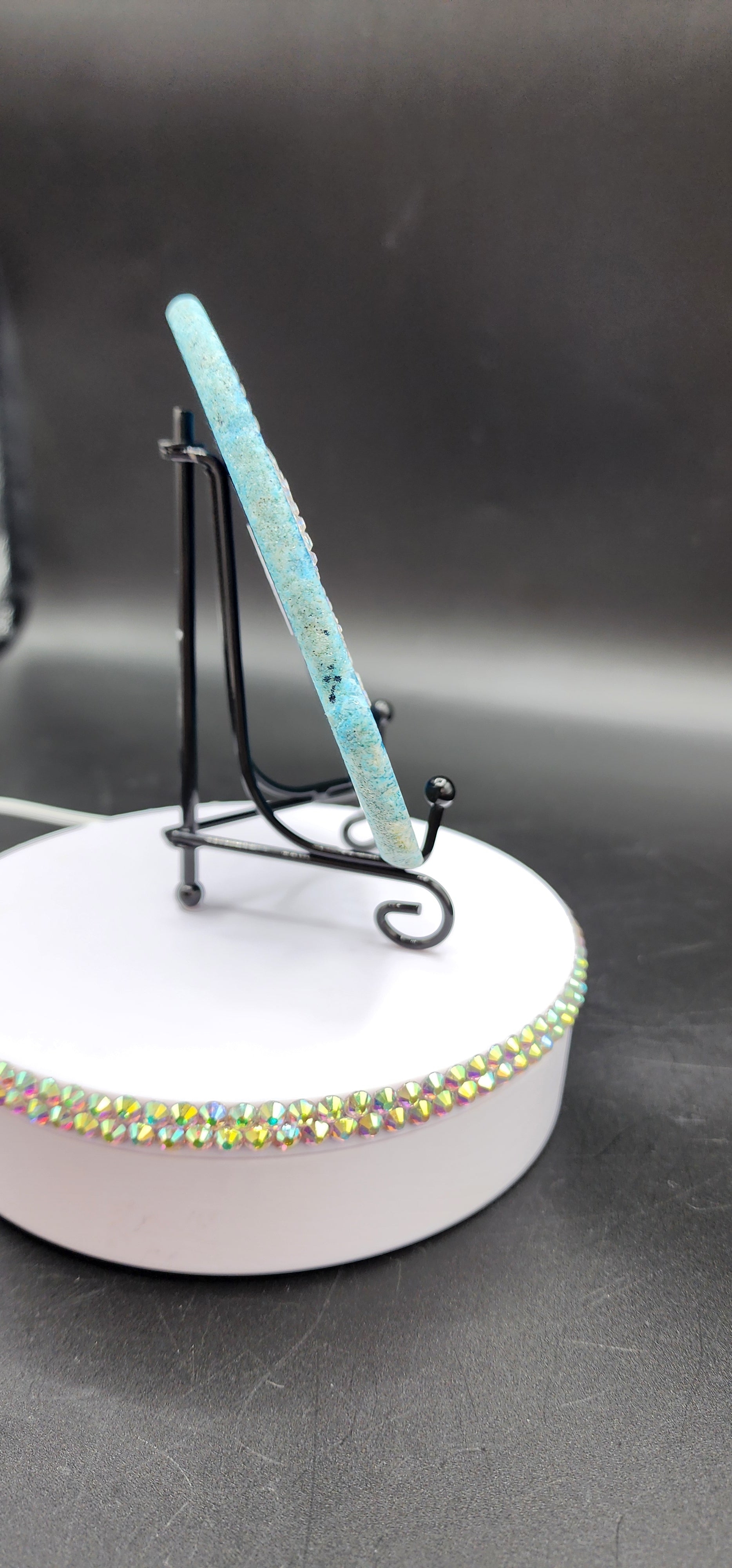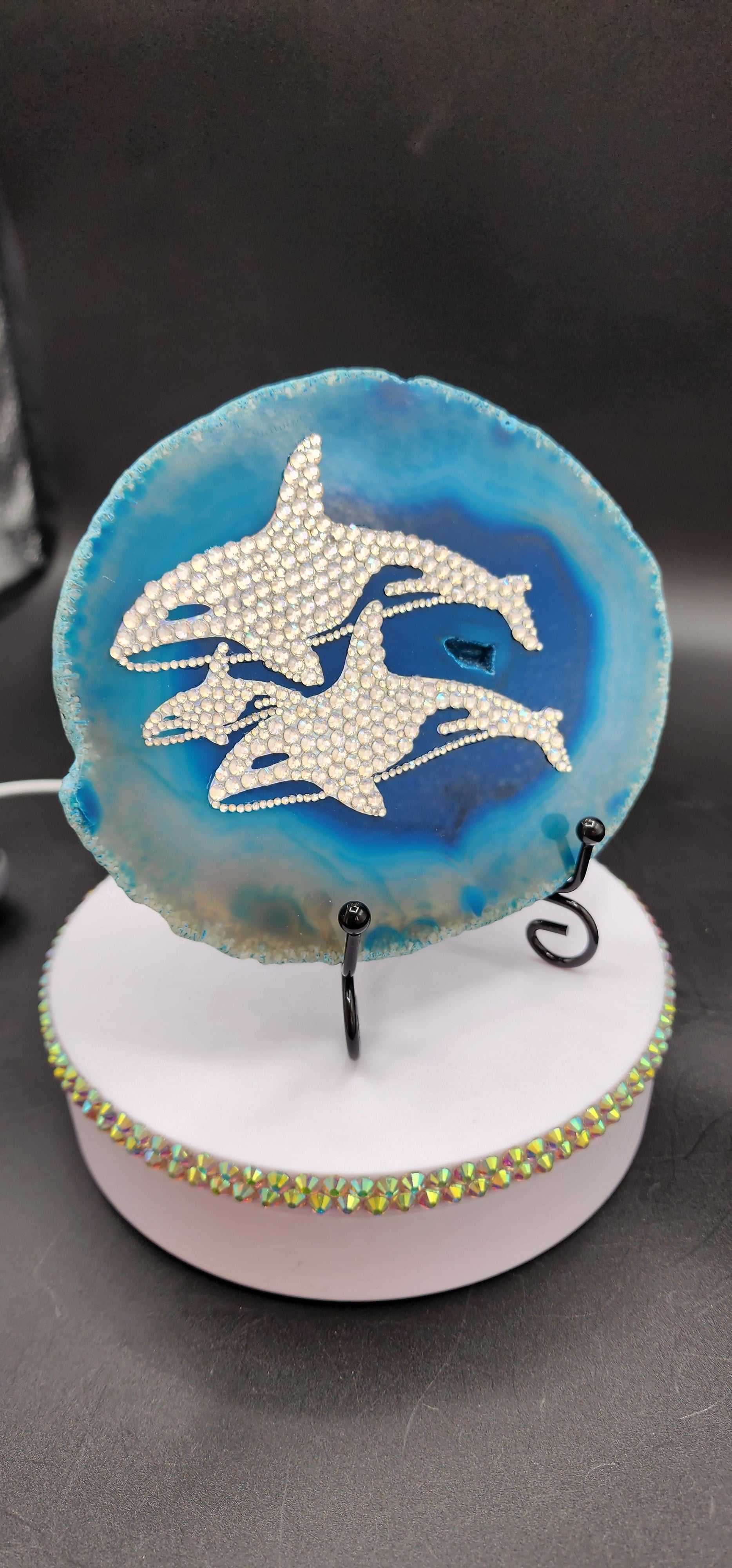 This luxury natural agate slice, with the amazing rainbow of northern lights rhinestones set in the design of a family of 3 orcas, swimming on a blue dyed agate slice. Black wire stand is included.