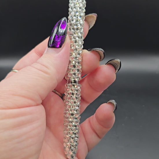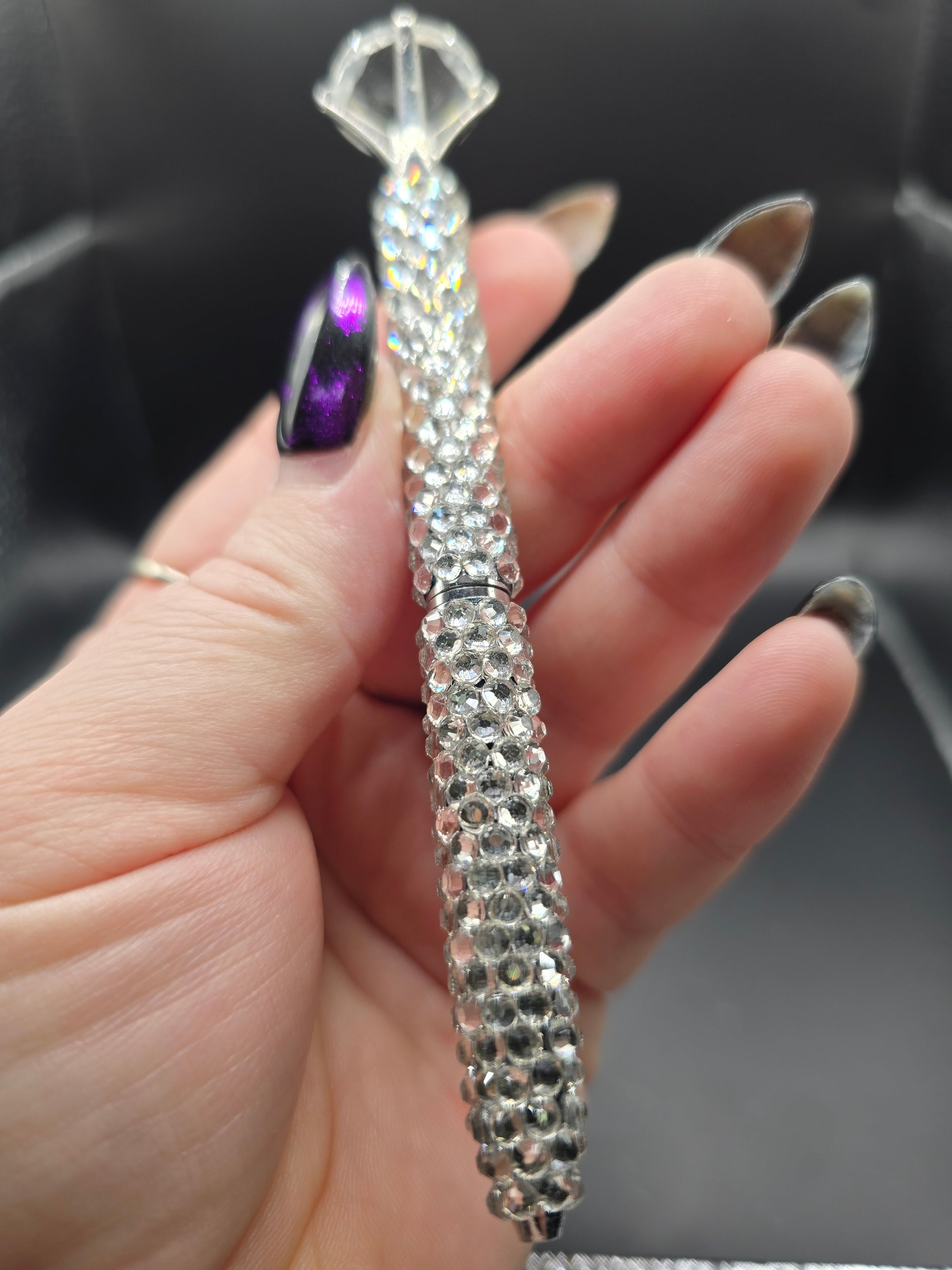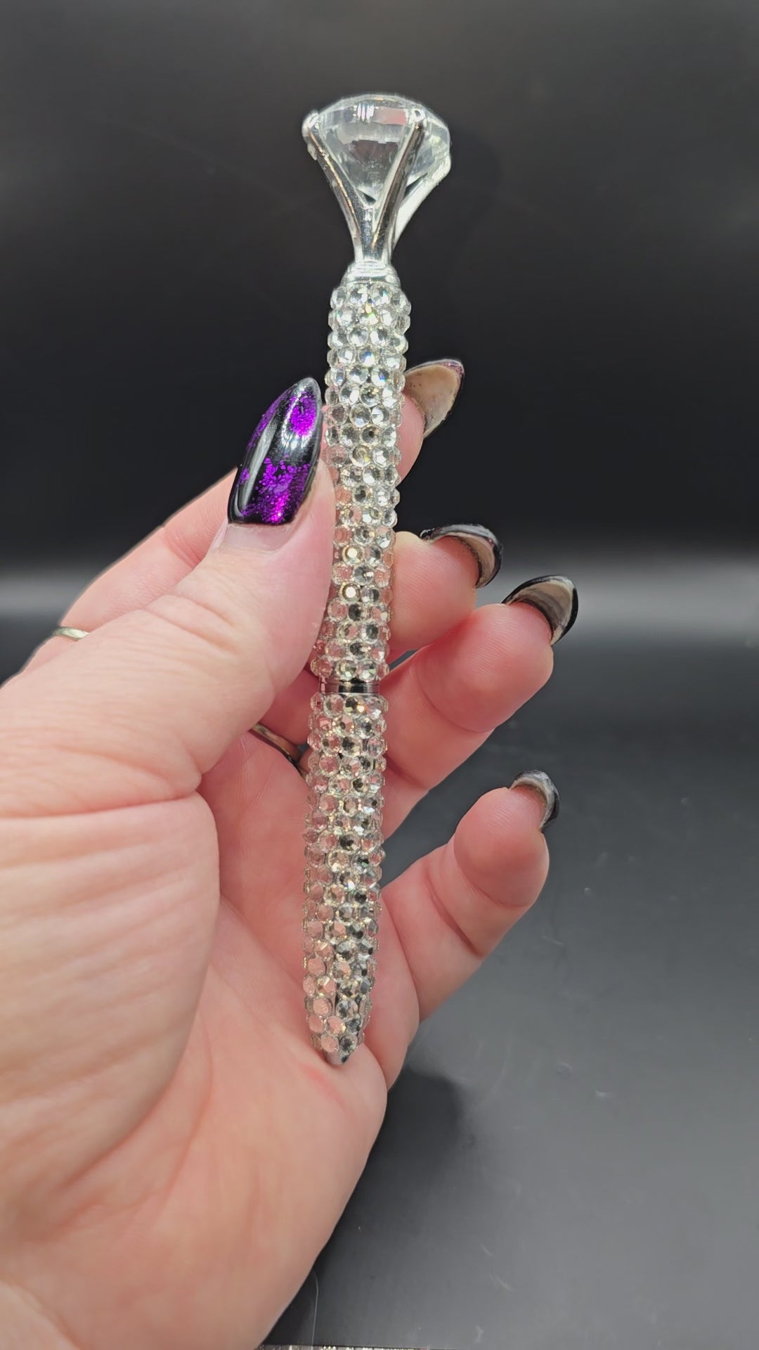 This hand made rhinestone, bling pen can be used for everyday life, the pen comes apart in the middle and the ink can be changed out. Comes with black ink. Then high quality silver glass rhinestones are adorned on the outside of the pen. Has a silver clasp with a faux diamond at the top.