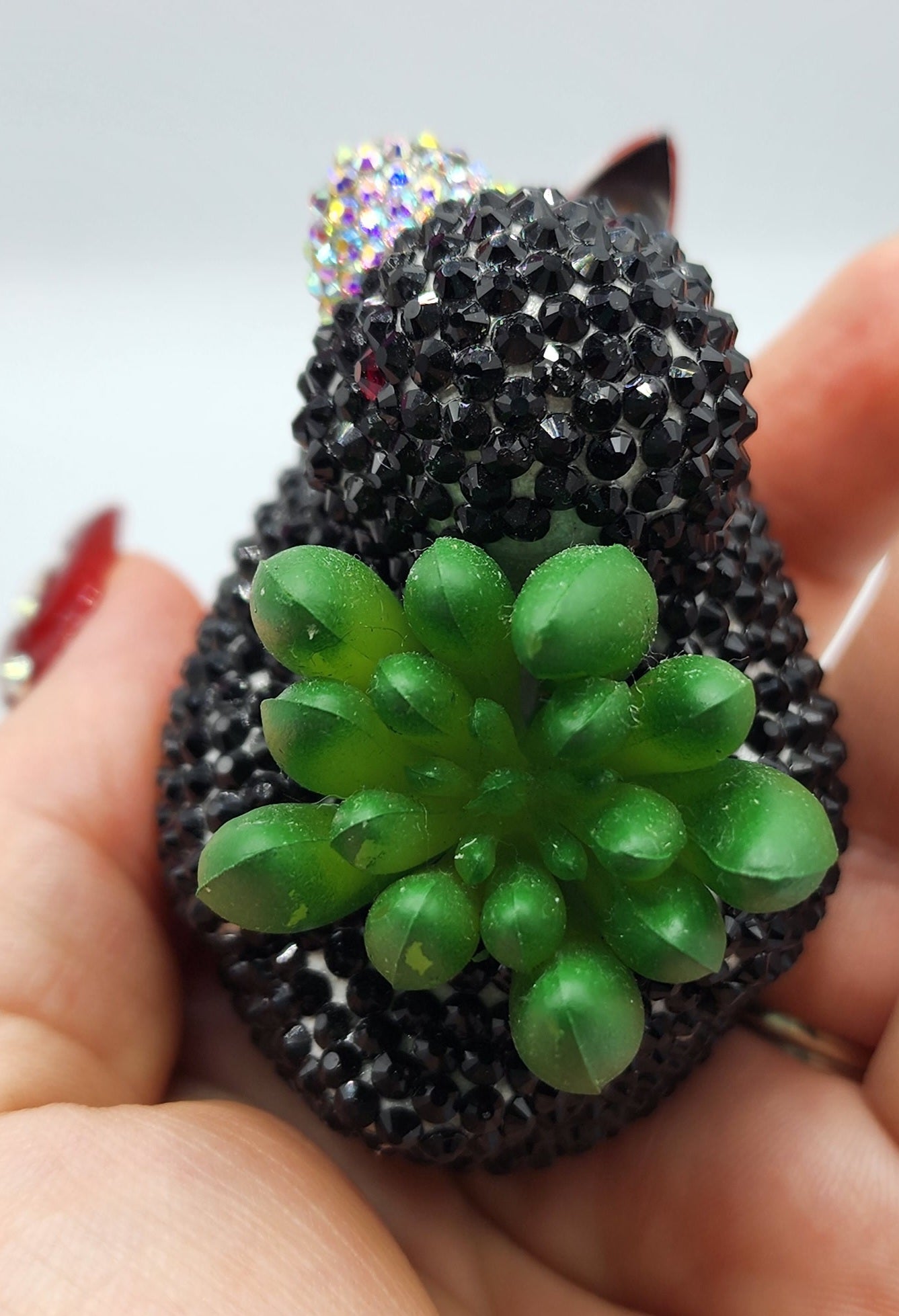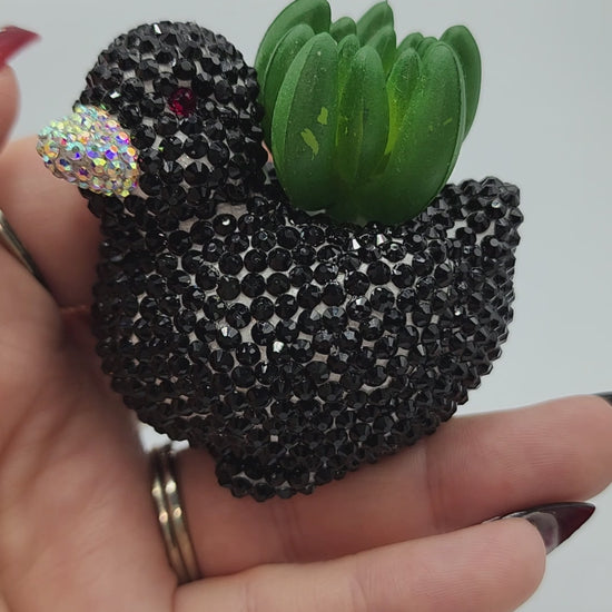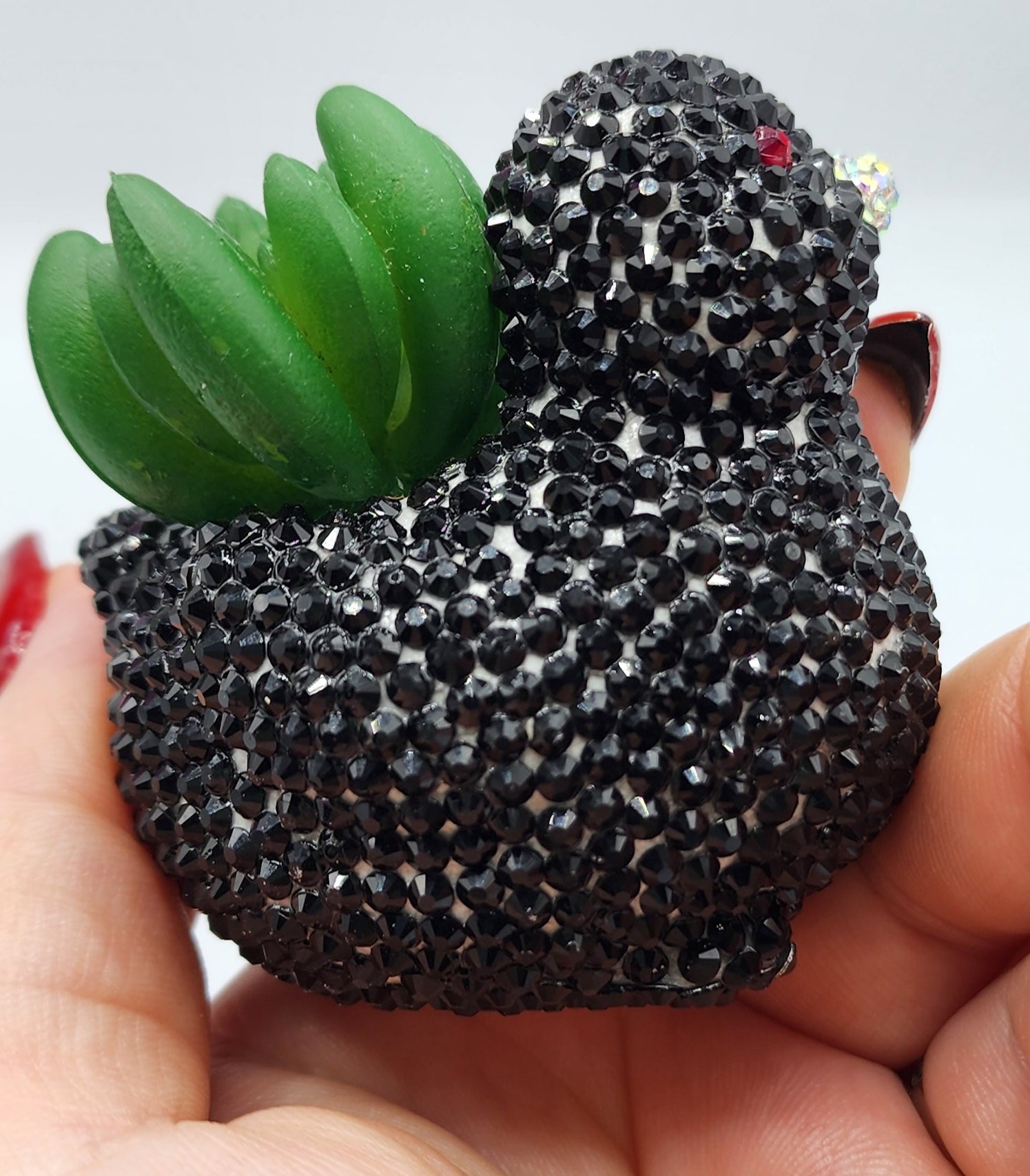 This hand made rhinestone, full bling mini duck, done in a high quality aurora borealis and jet black rhinestone on a duck made from cement, also has a plastic succulent on top, the only kind of plant I can't kill. Red eyes for effect.