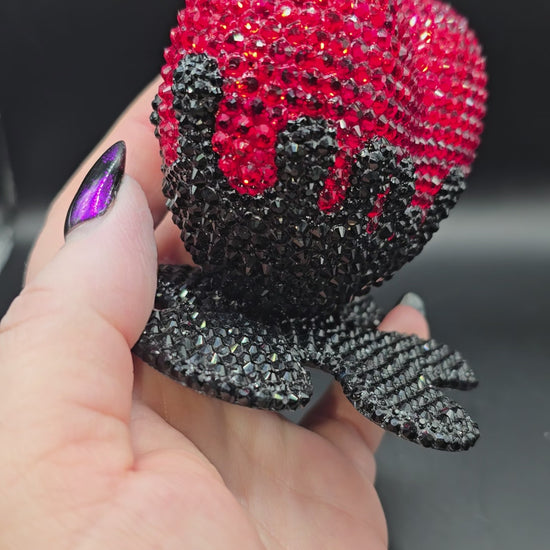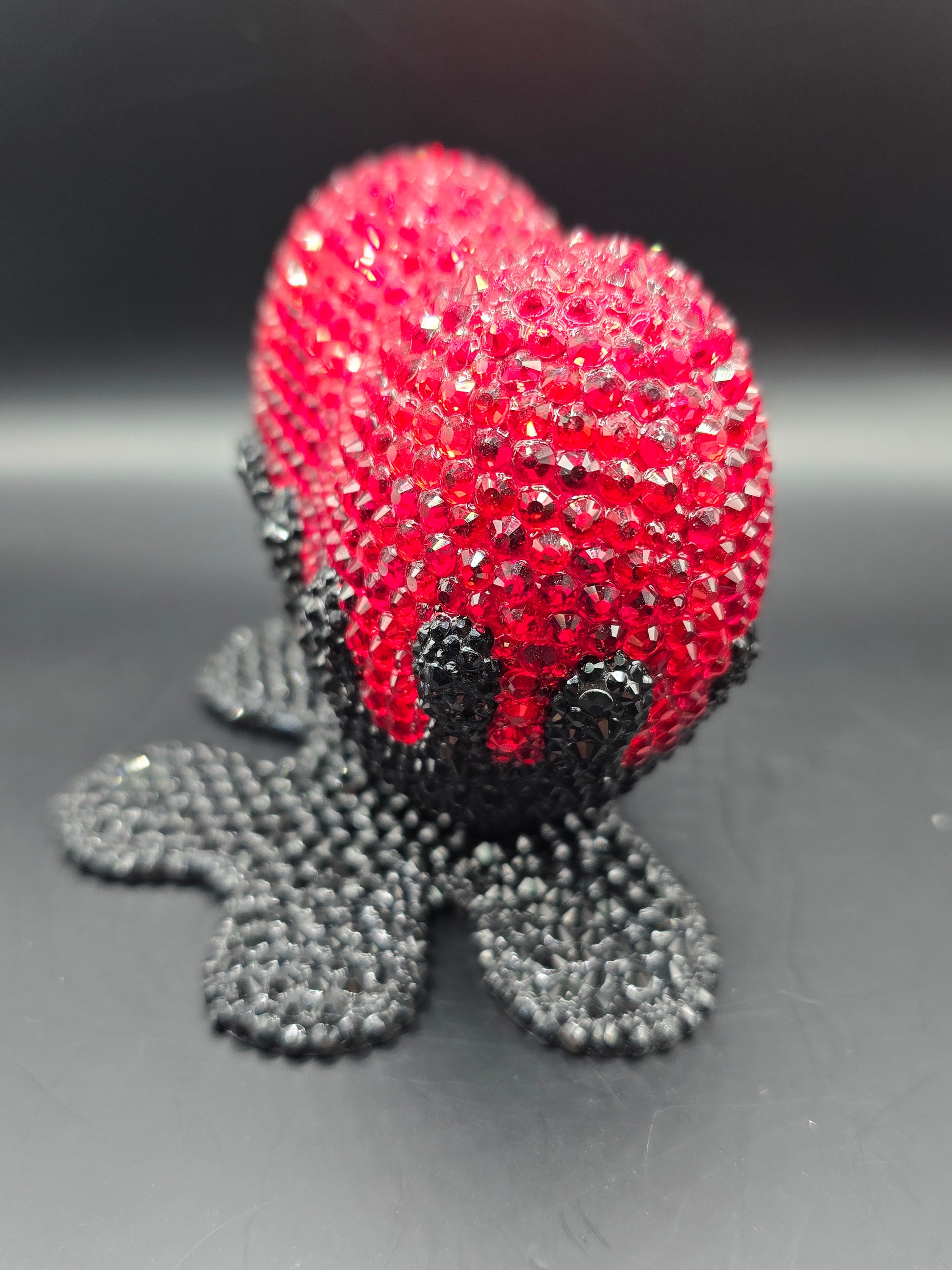 This hand made 3D printed heart dropped into black paint, hand painted red with high quality glass rhinestones attached one at a time. Heart looks like it was dropped into black paint with black rhinestones.