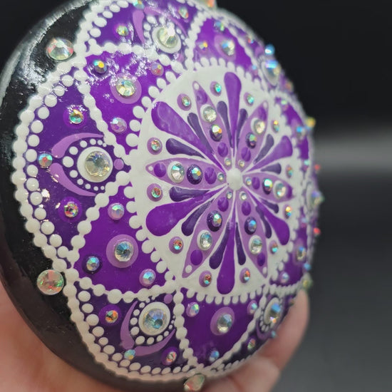 This handmade mandala stone was brought to life with a black background and then painted with a mandala design. high-quality glass aurora borealis rhinestones applied in a sacred geometry pattern.