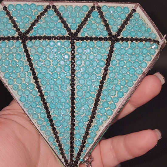 This hand made rhinestone, bling coin purse in the shape of a diamond, done in a high quality glass, teal, resembles tiffany blue color rhinestones on a pleather diamond coin purse with zipper open and close. Also has a keychain ring attached.