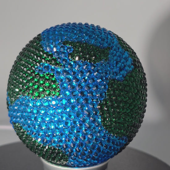 This handmade wooden sphere painted to look like Earth with high quality glass rhinestones attached one at a time. These blue and green rhinestones come together to see our beautiful planet in small, sparkly form.