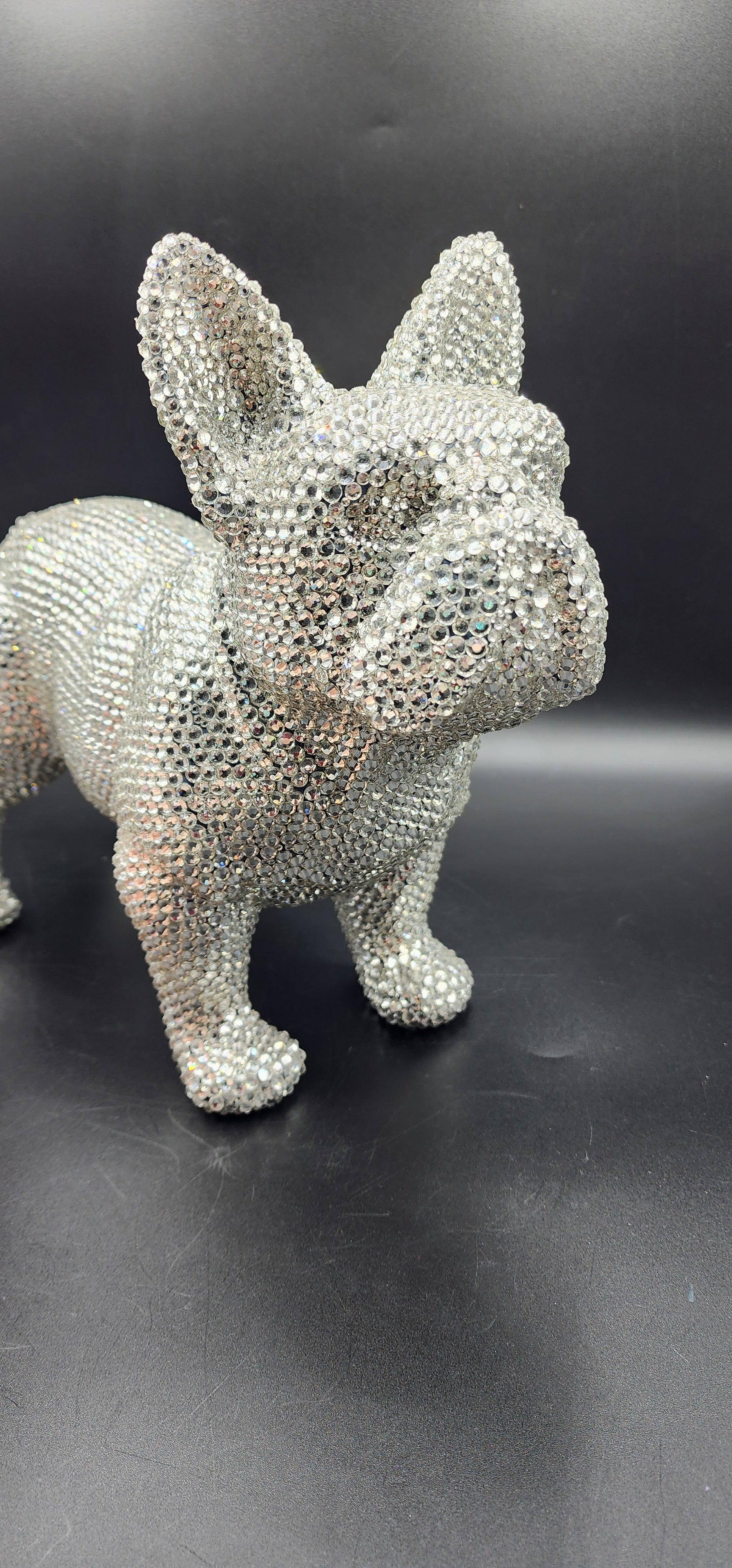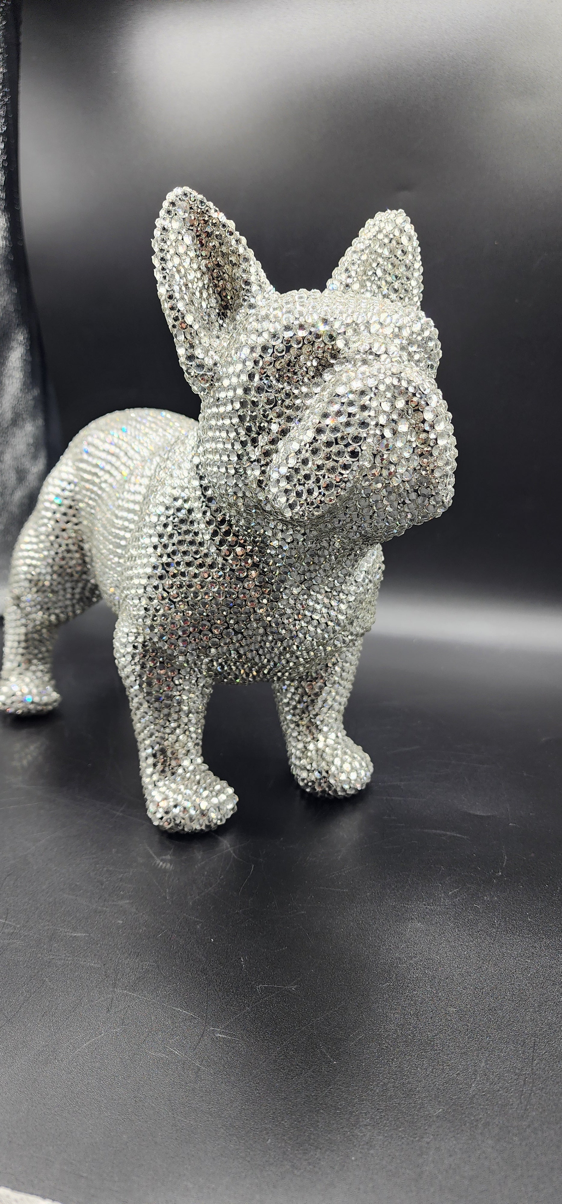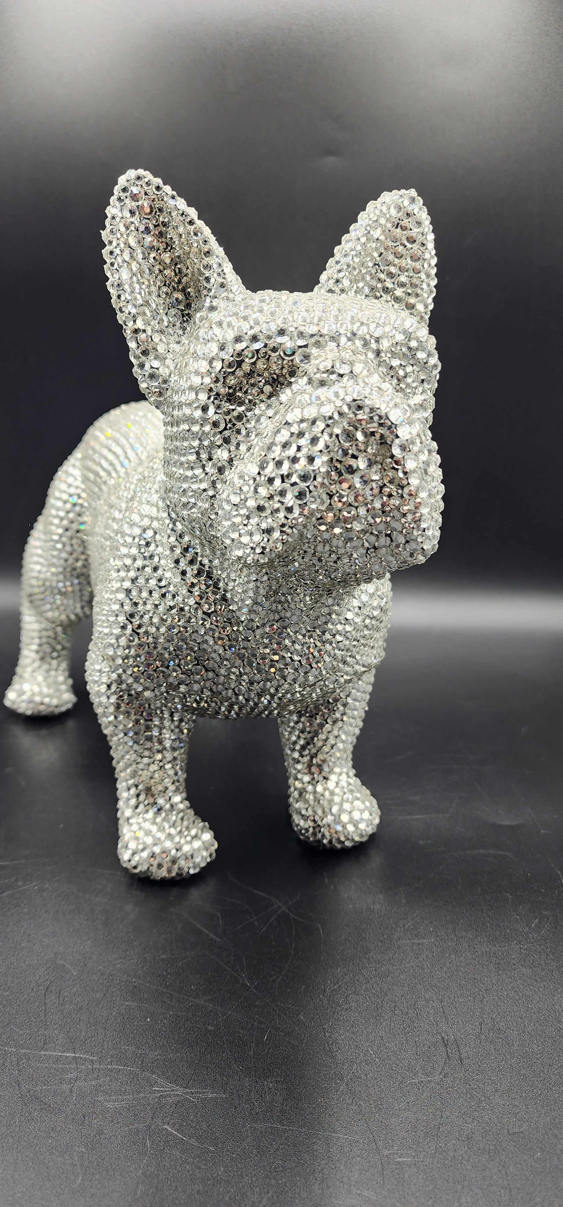 This hand made rhinestone, full bling, large French bulldog statue, done in a high quality silver rhinestones which shoot beautiful rainbows when the light hits them. This guy is almost a full size version of the real thing, without all the dog hair and snorting.