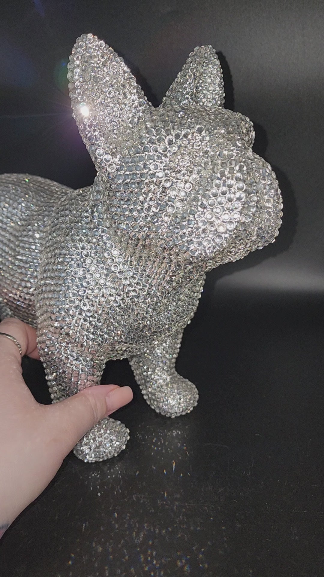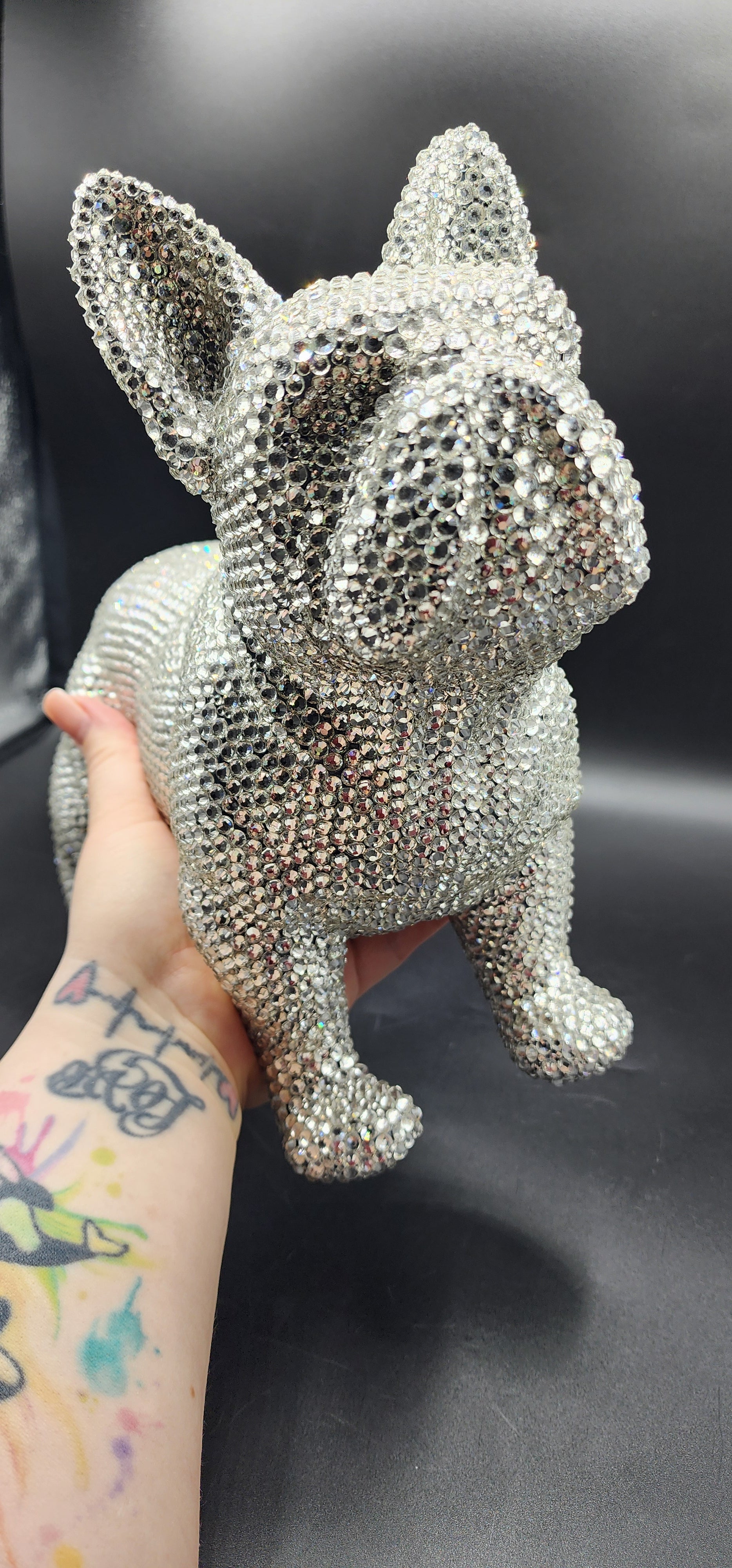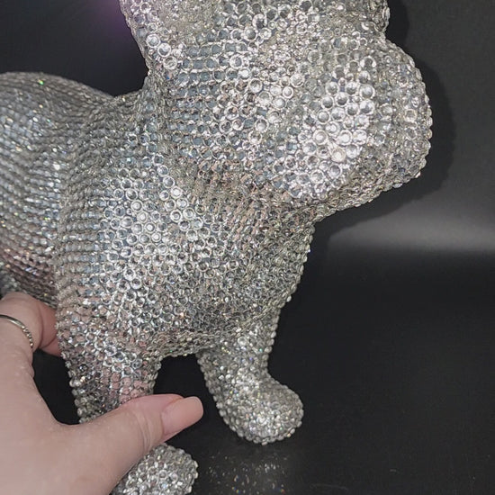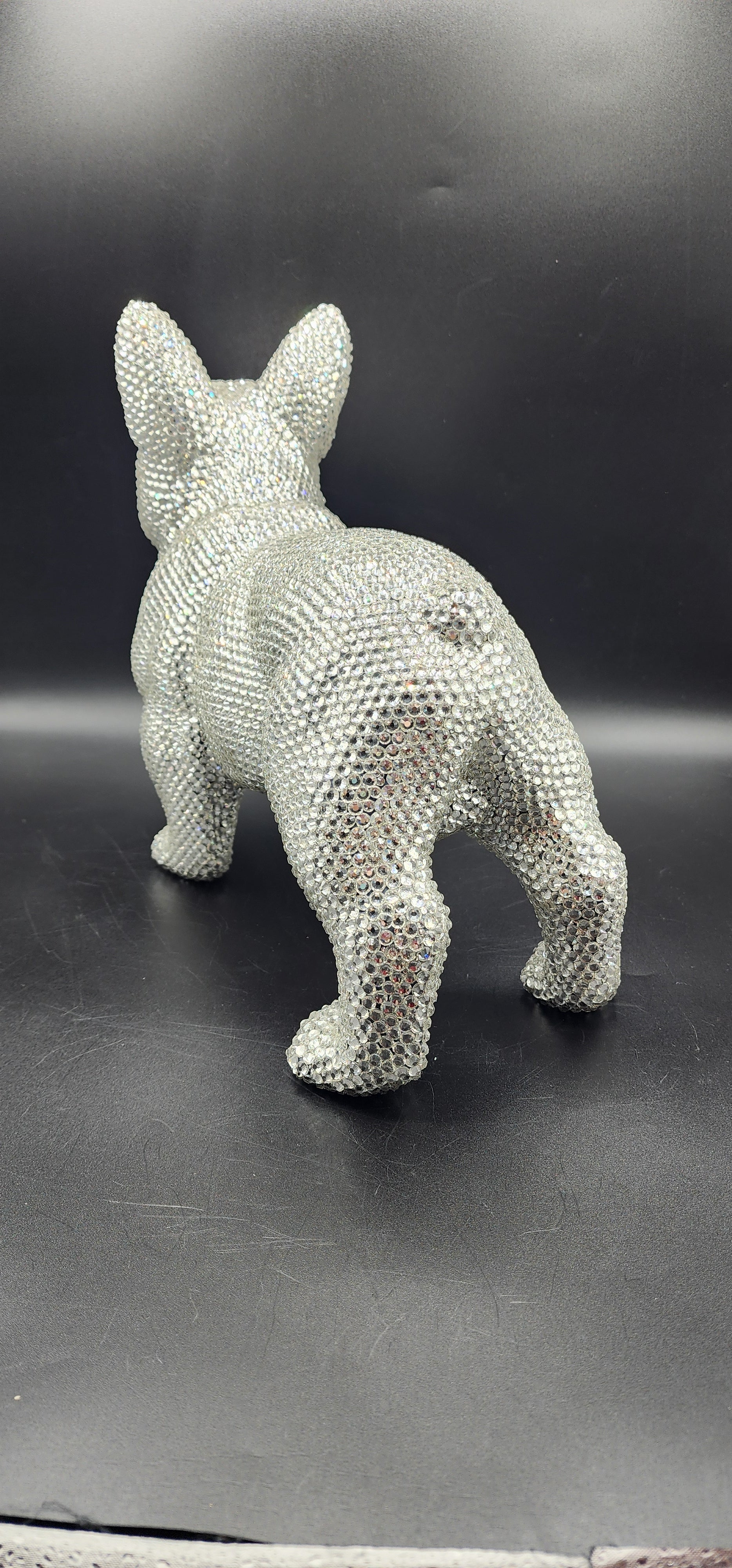 This hand made rhinestone, full bling, large French bulldog statue, done in a high quality silver rhinestones which shoot beautiful rainbows when the light hits them. This guy is almost a full size version of the real thing, without all the dog hair and snorting.