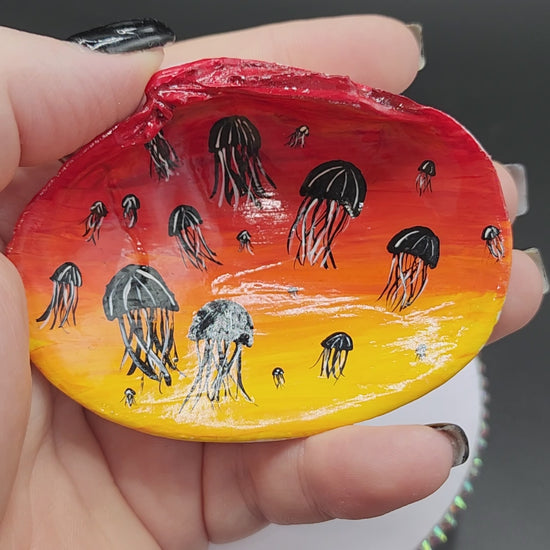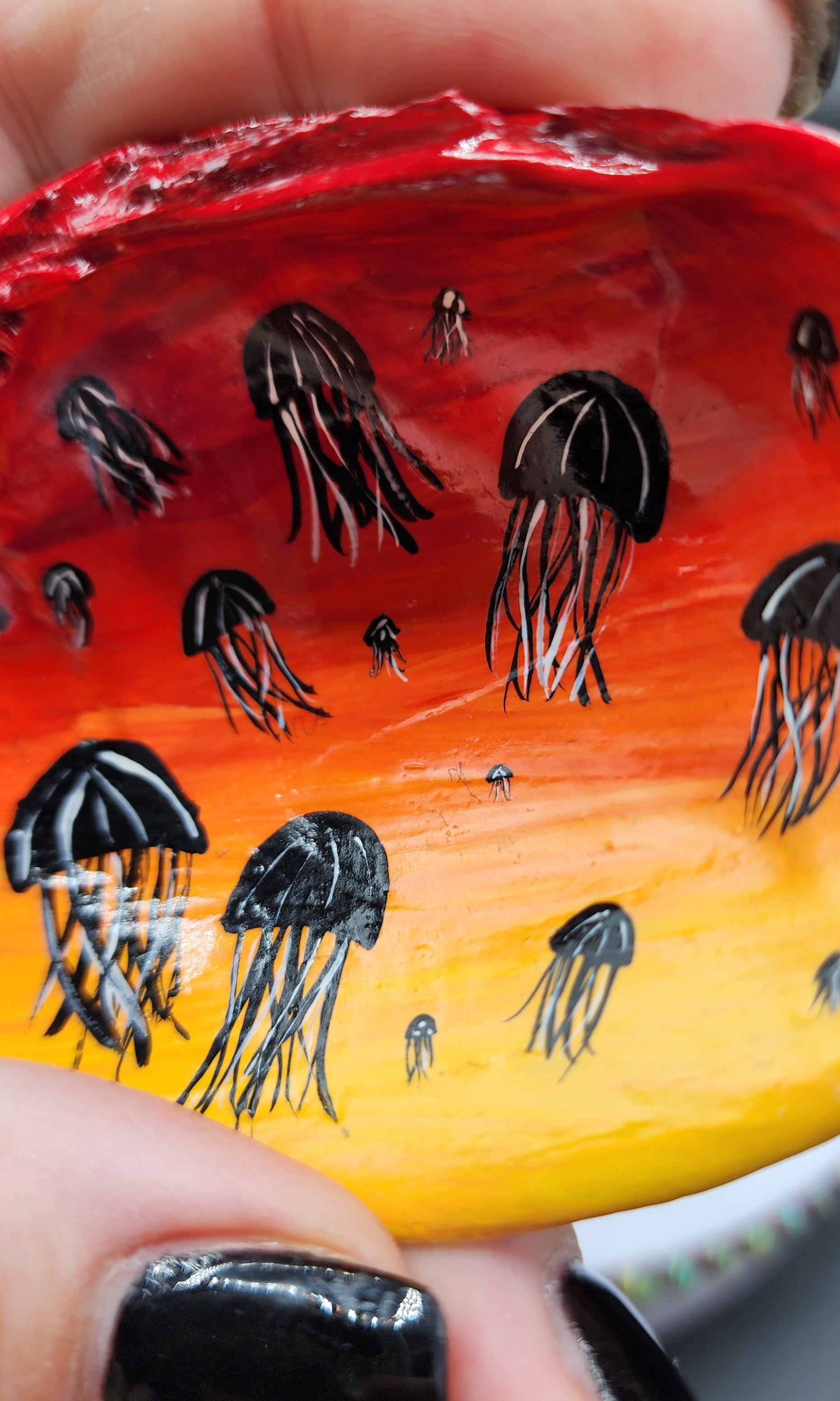 This is painted on a hand collected sea shell from the Pacific Ocean off of Vancouver Island, this one is painted with a sunset a bunch of happy little jellyfish from the ocean.