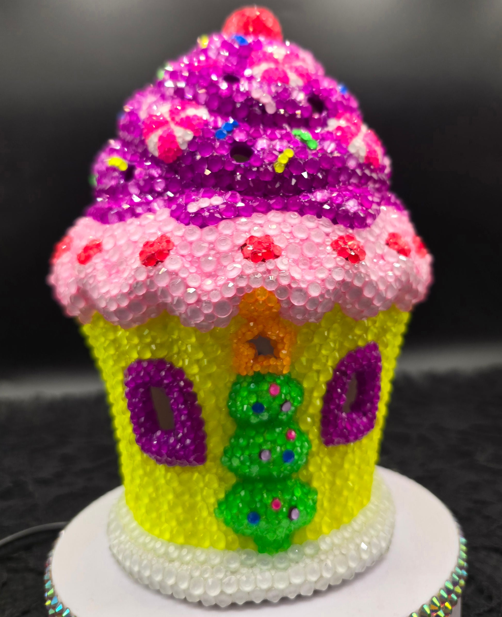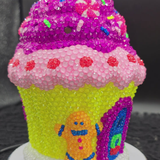 This hand painted, ceramic, magical, mythical cupcake house, absolutely adorable in full bling. High quality glass rhinestones applied after being hand painted. This house is perfect for any fairy tale creatures living in your home. Ceramic piece, that lights up from the inside.