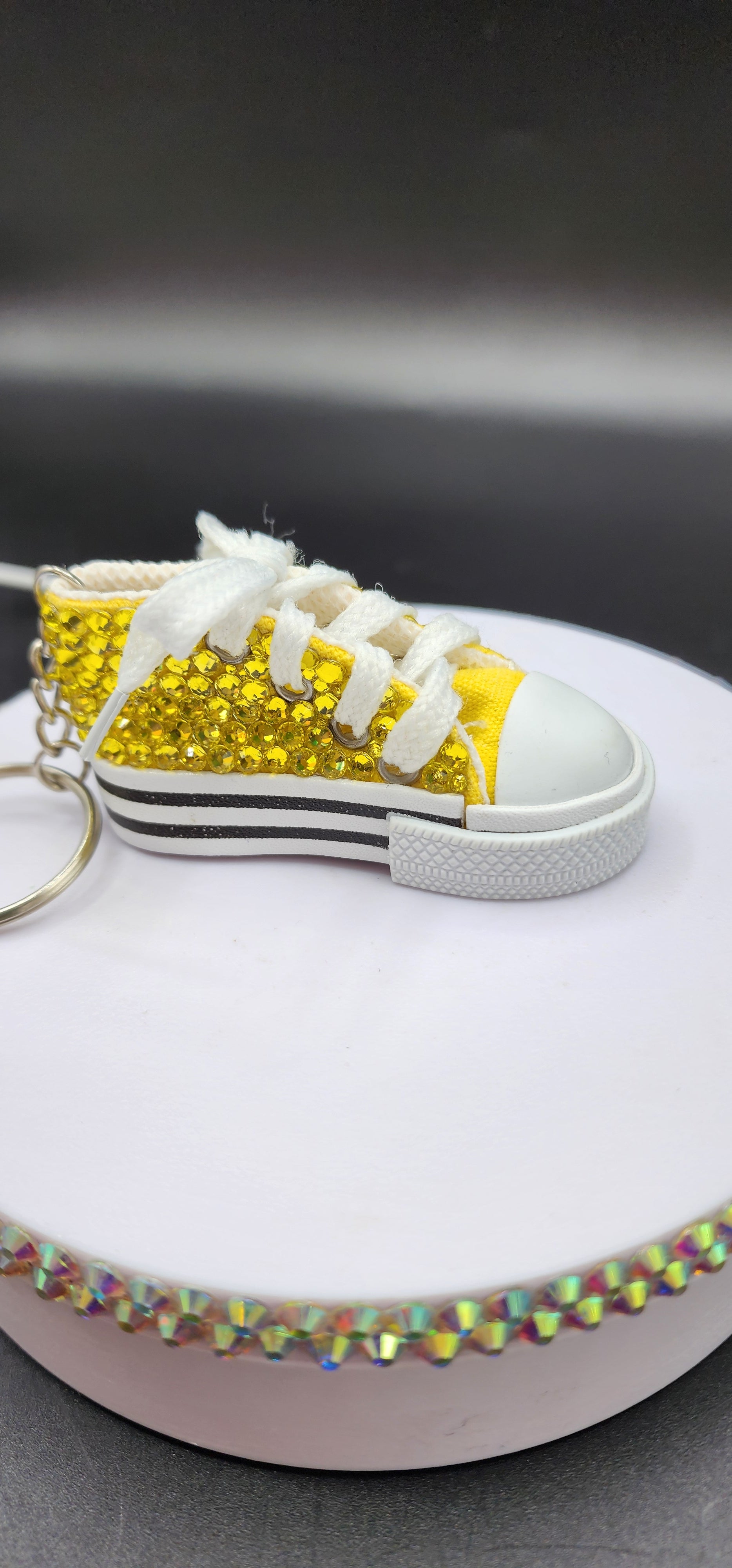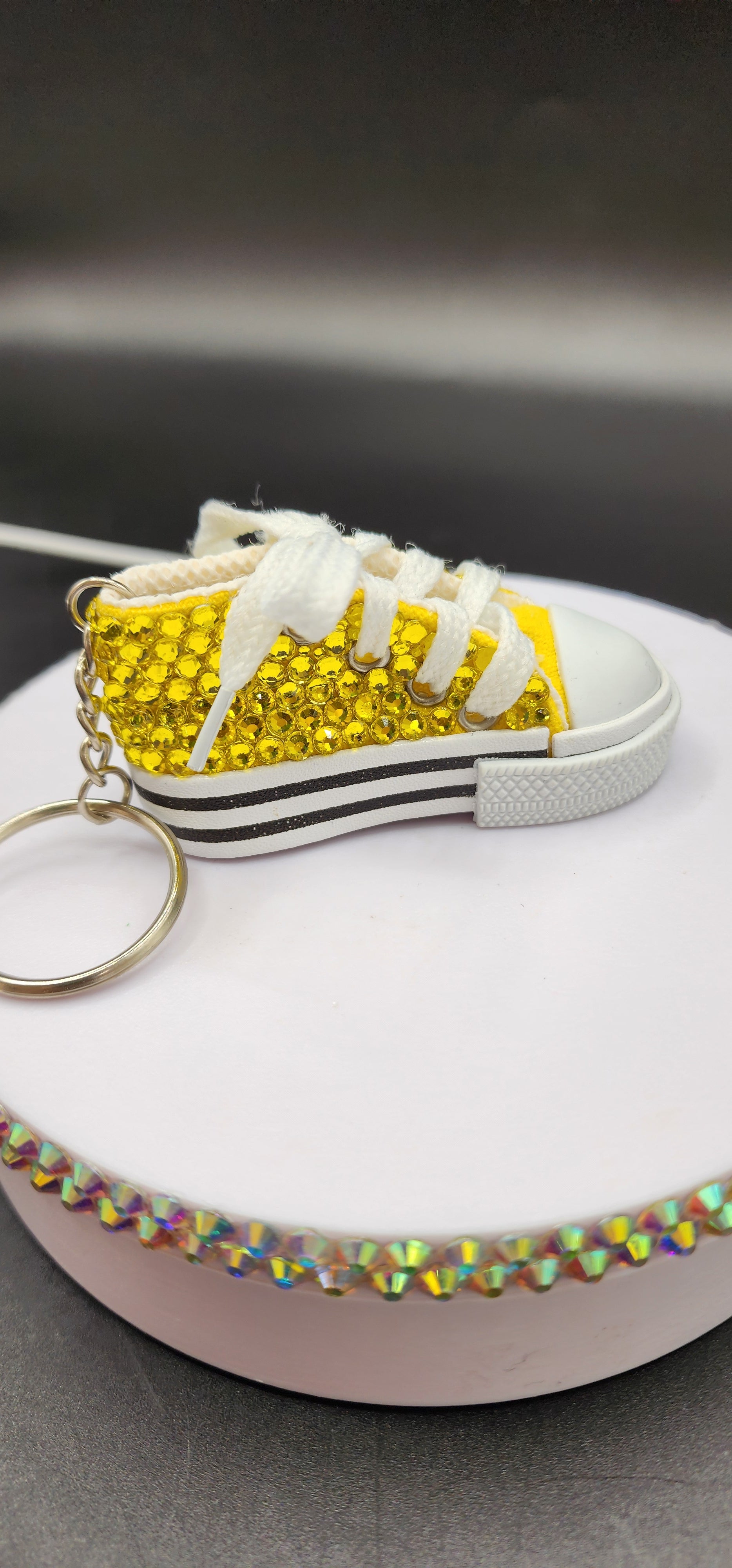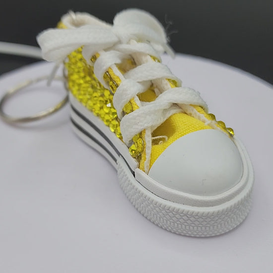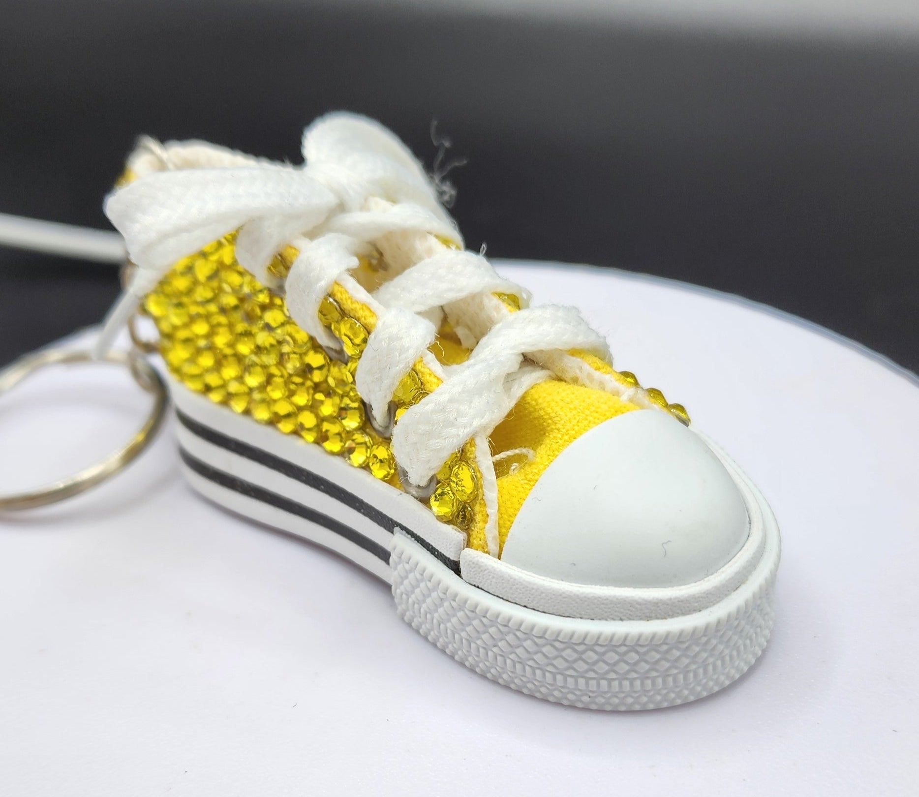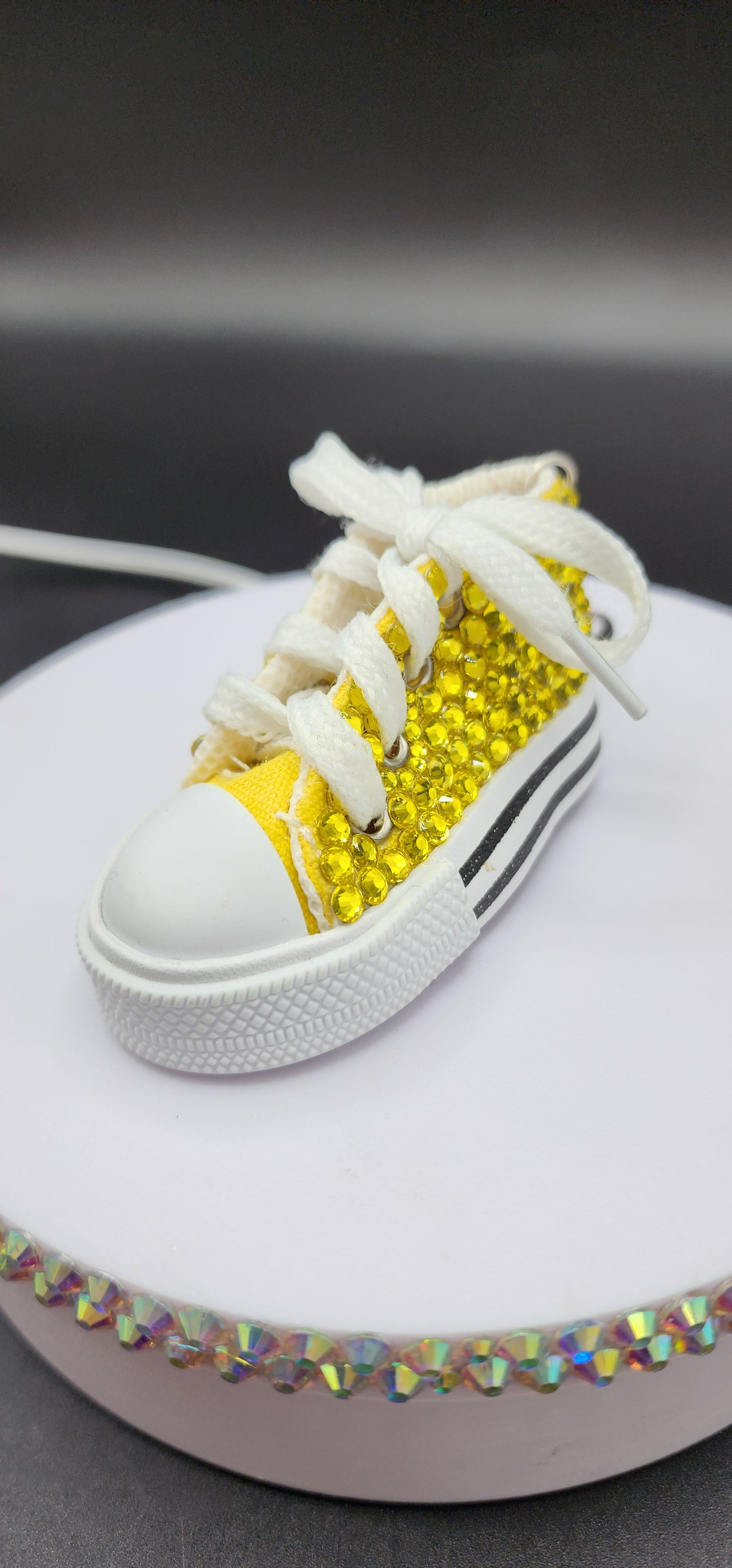 This hand made rhinestone, full bling mini shoe, chucks, done in a high quality, glass yellow rhinestone on a mini yellow canvas shoe, keychain.