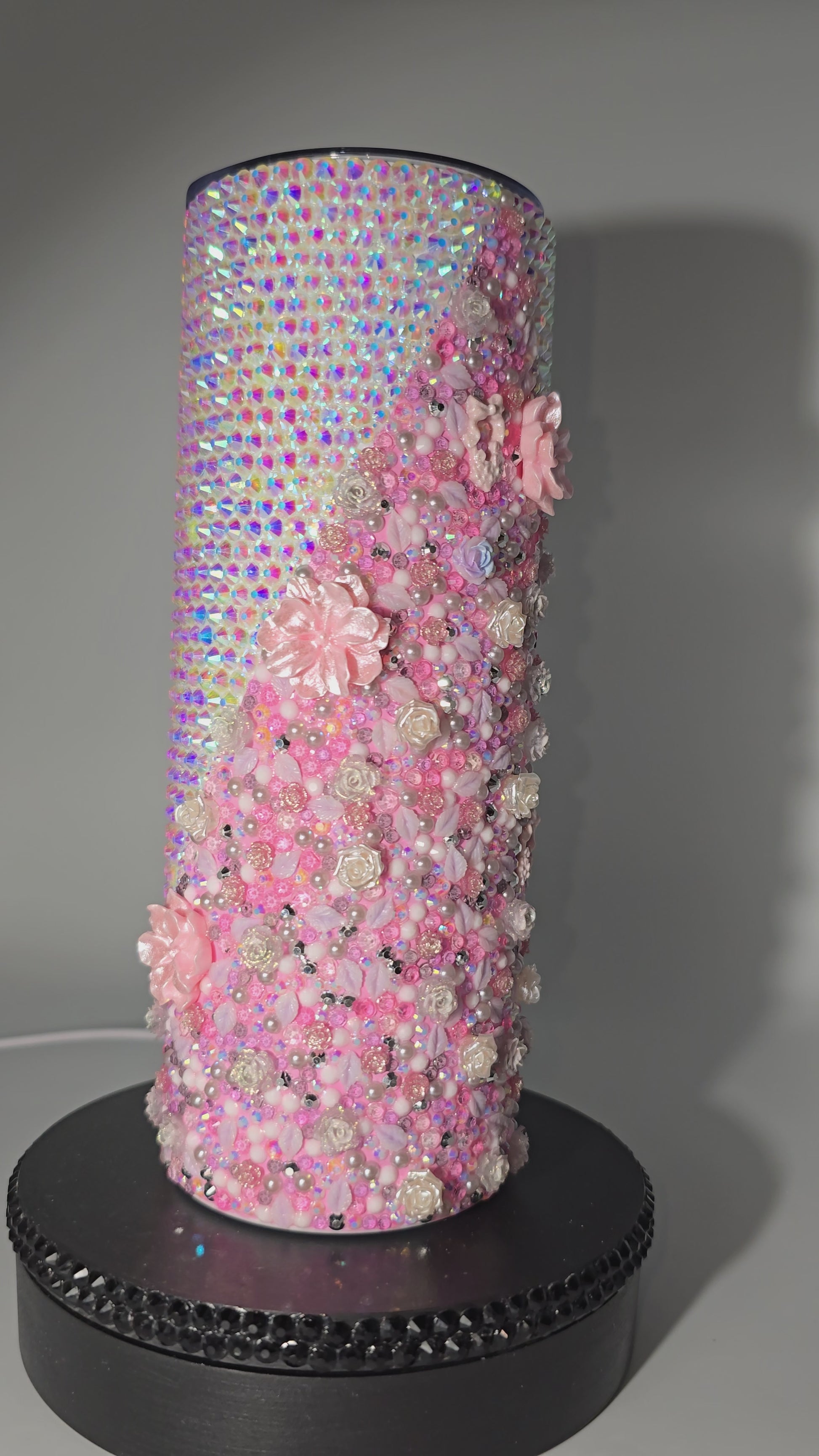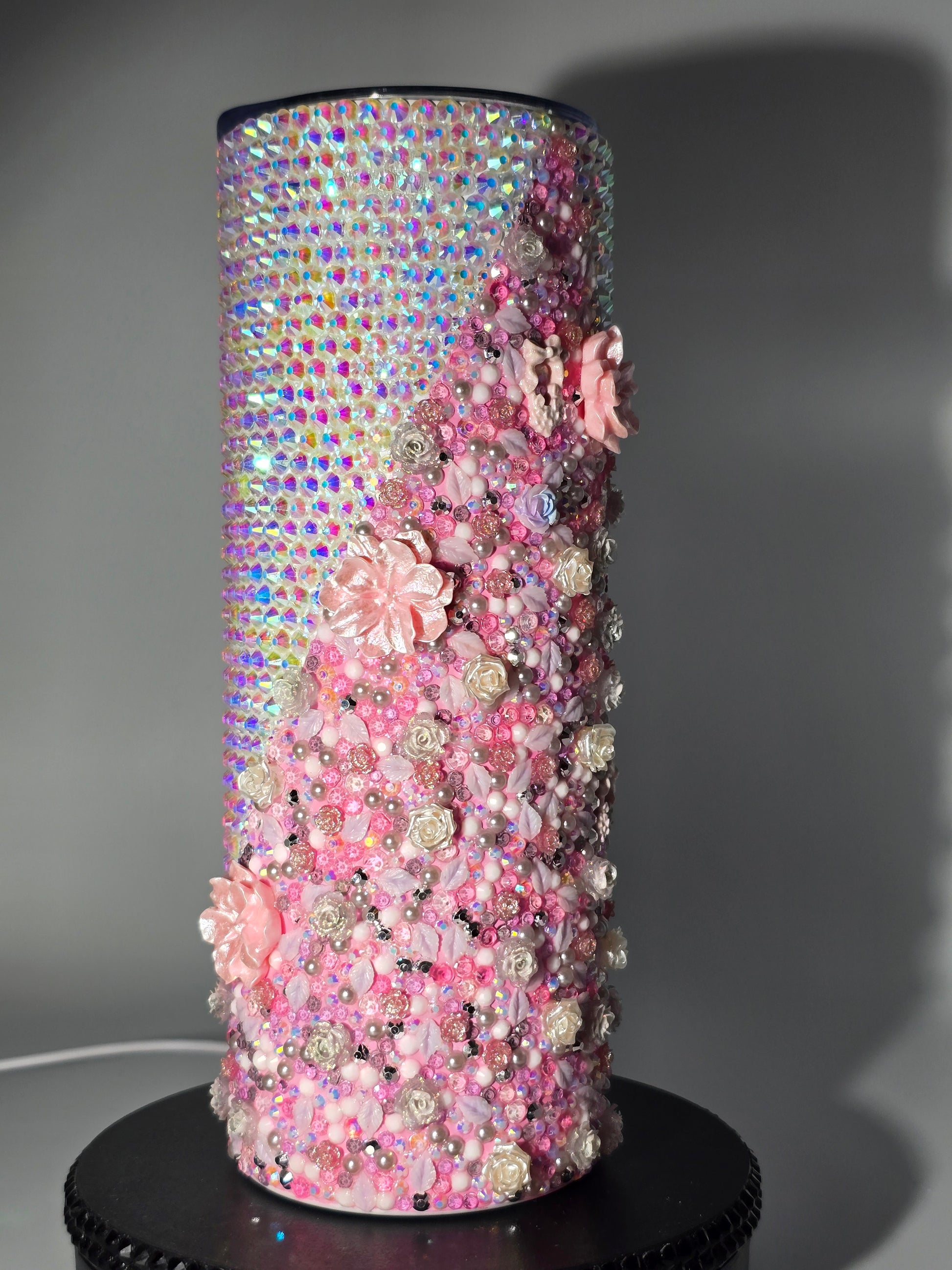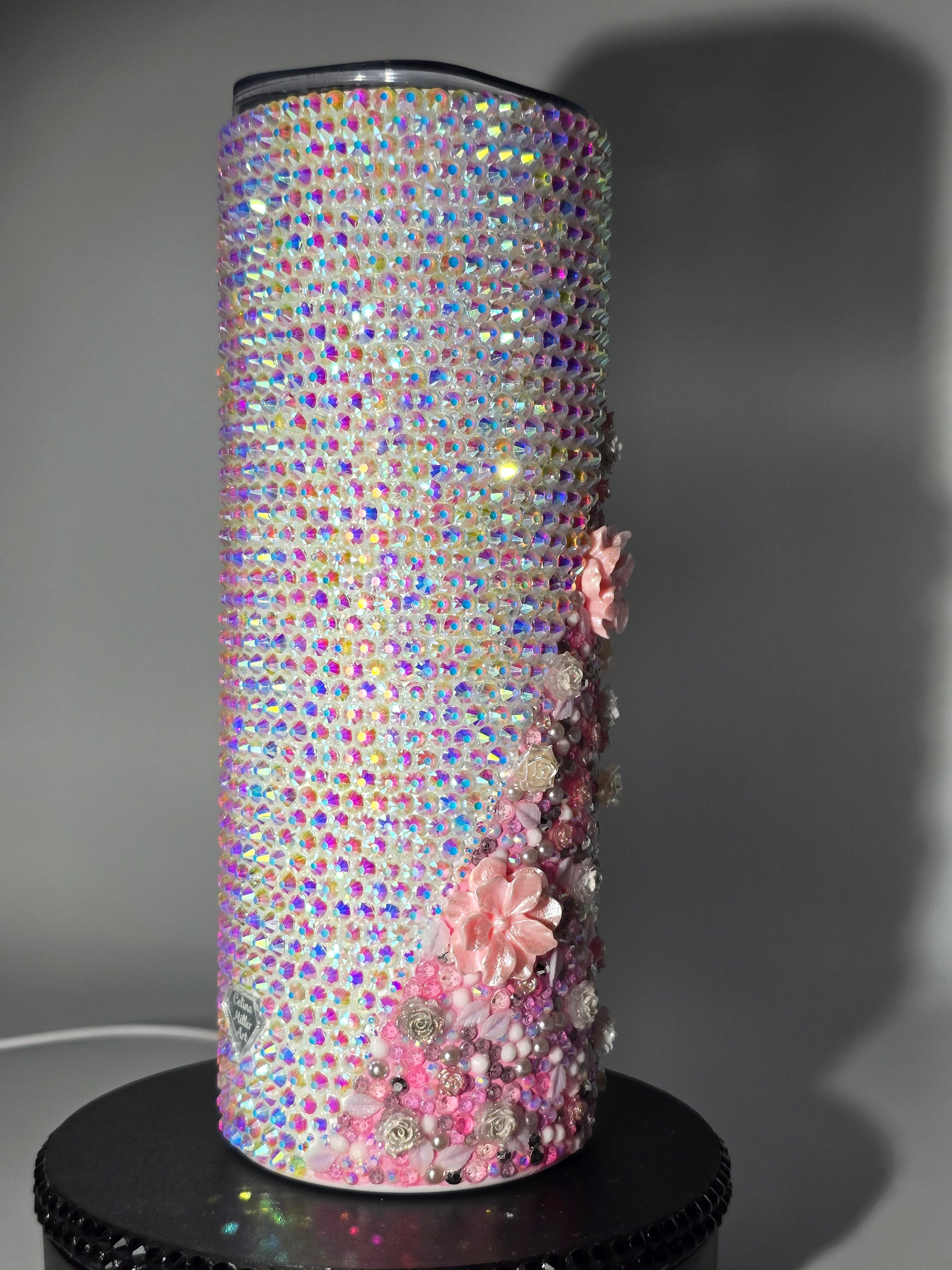 This handmade rhinestone tumbler is done on a 20 oz high-quality stainless-steel tumbler, full bling. Done in a high-quality colored glass rhinestones in pink floral with aurora borealis background. Very durable, hand wash only, no dishwasher, no high heat exposure but this tumbler is meant for use. Good for hot and cold liquids.