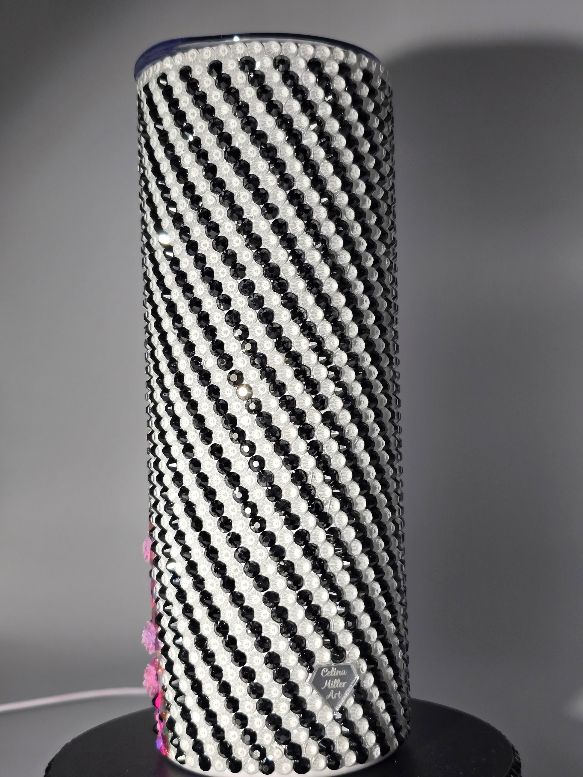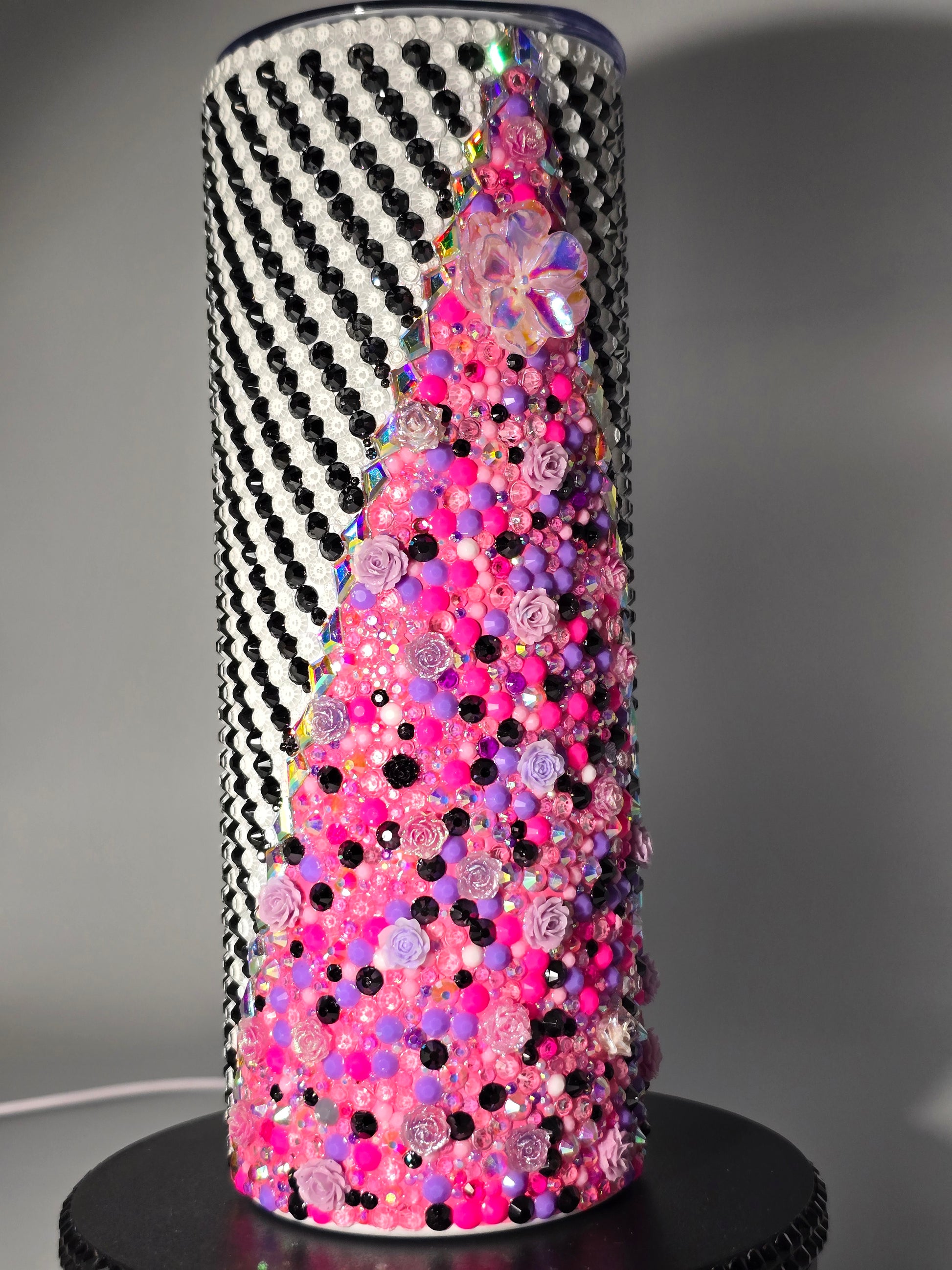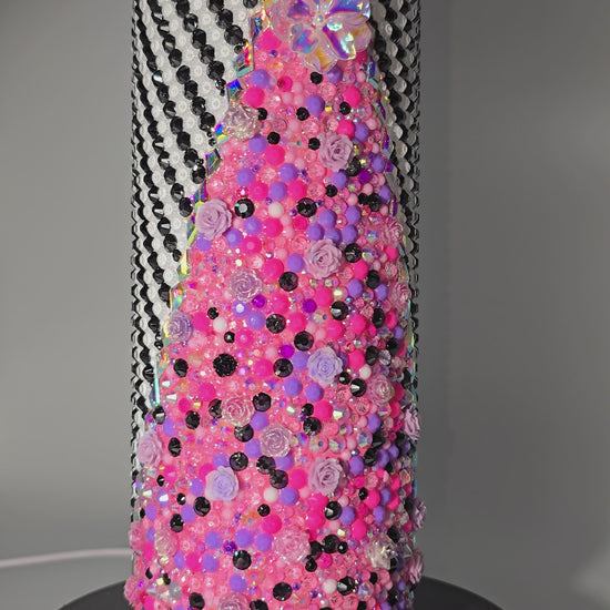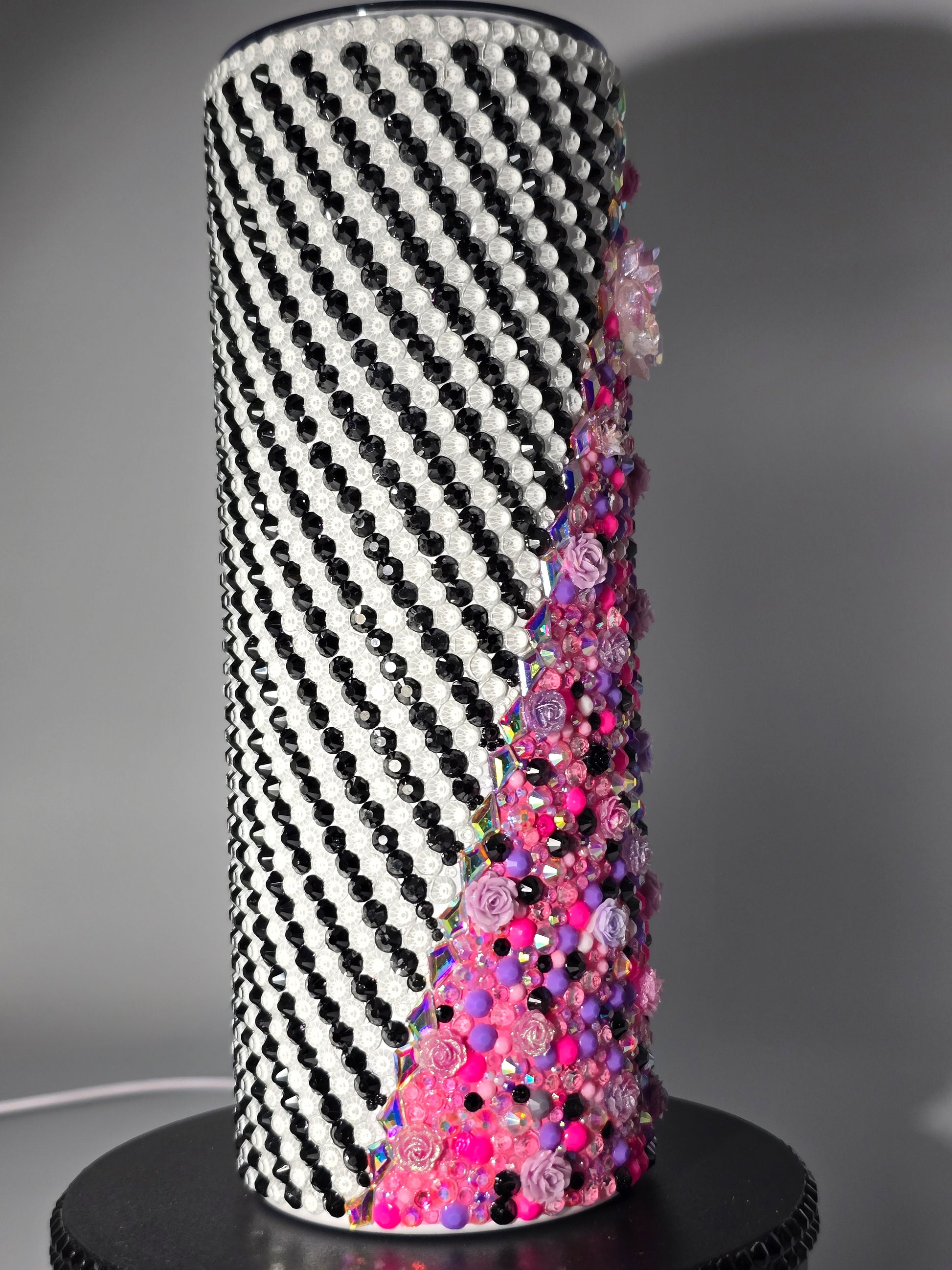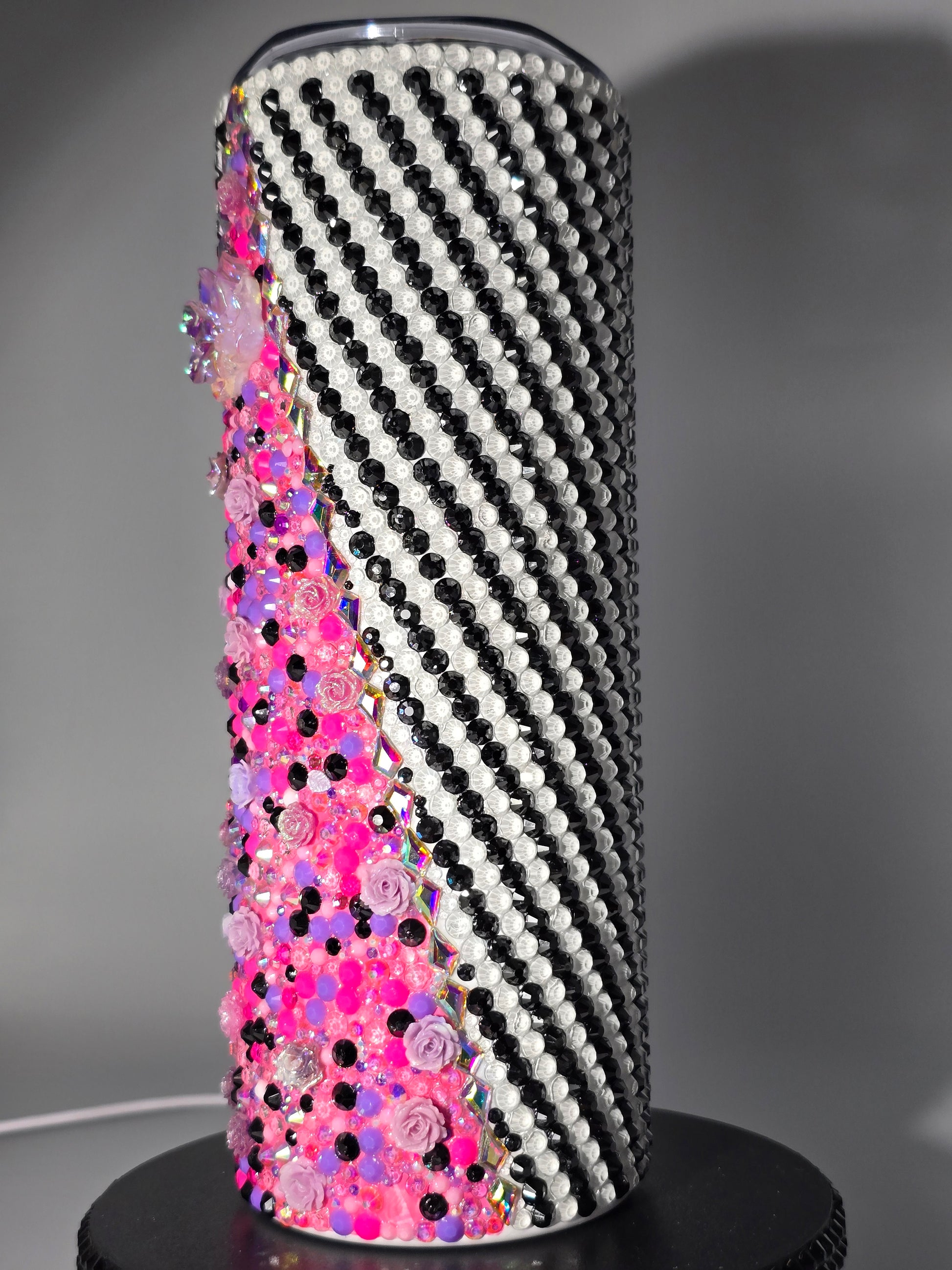 This handmade rhinestone tumbler is done on a 20 oz high-quality stainless-steel tumbler, full bling. Done in a high-quality colored glass rhinestones in pink floral with black and white background. Very durable, hand wash only, no dishwasher, no high heat exposure but this tumbler is meant for use. Good for hot and cold liquids.