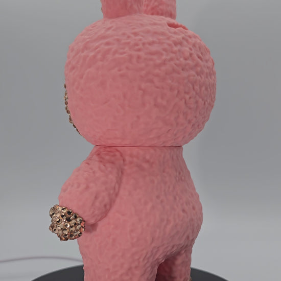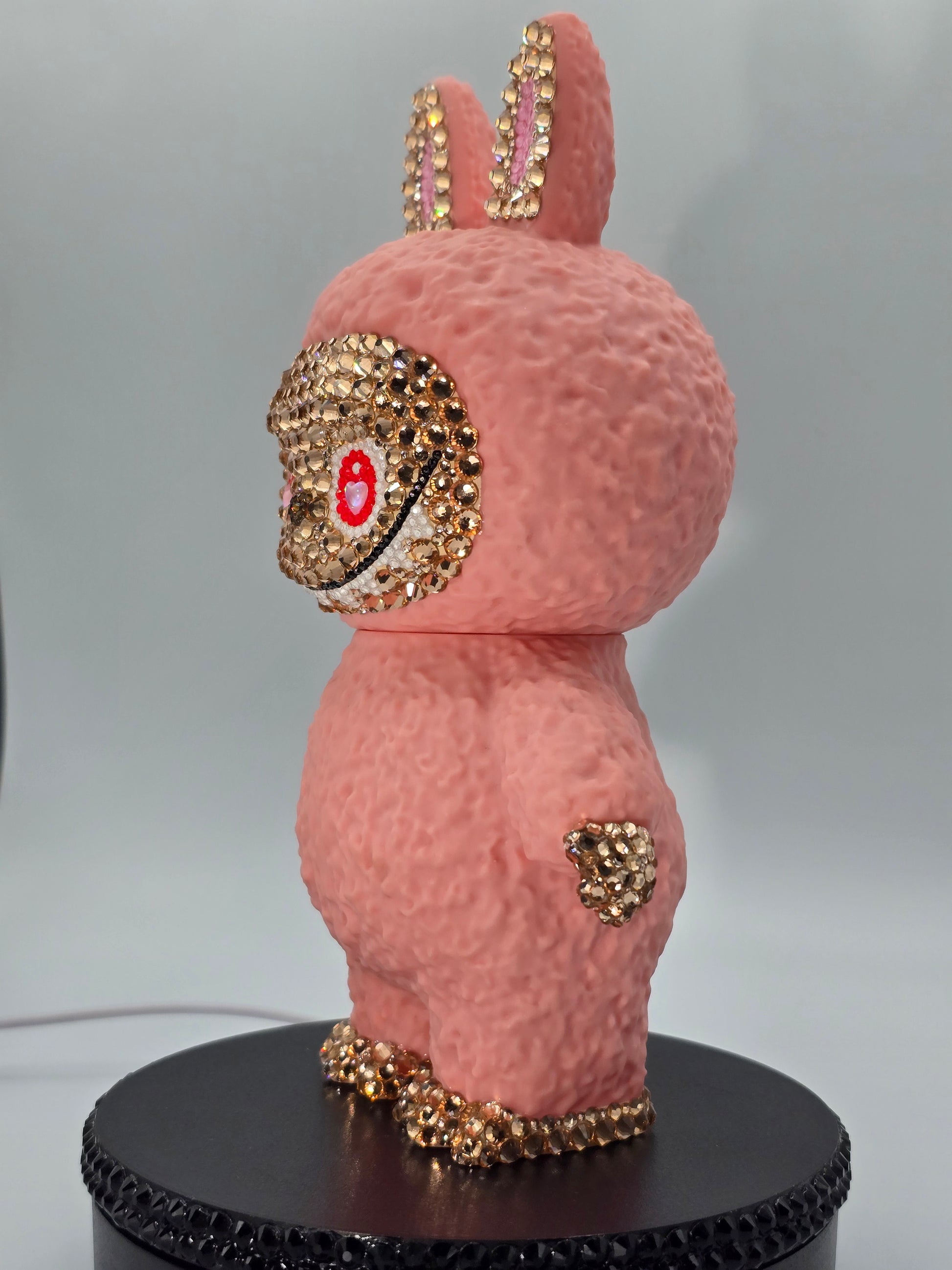 Pvc material, magical, pink Labubu piggy bank, absolutely adorable bling. High quality glass rhinestones applied. This piggy bank is perfect for any Labubu loving person in your life. The head comes off to open the piggy bank.