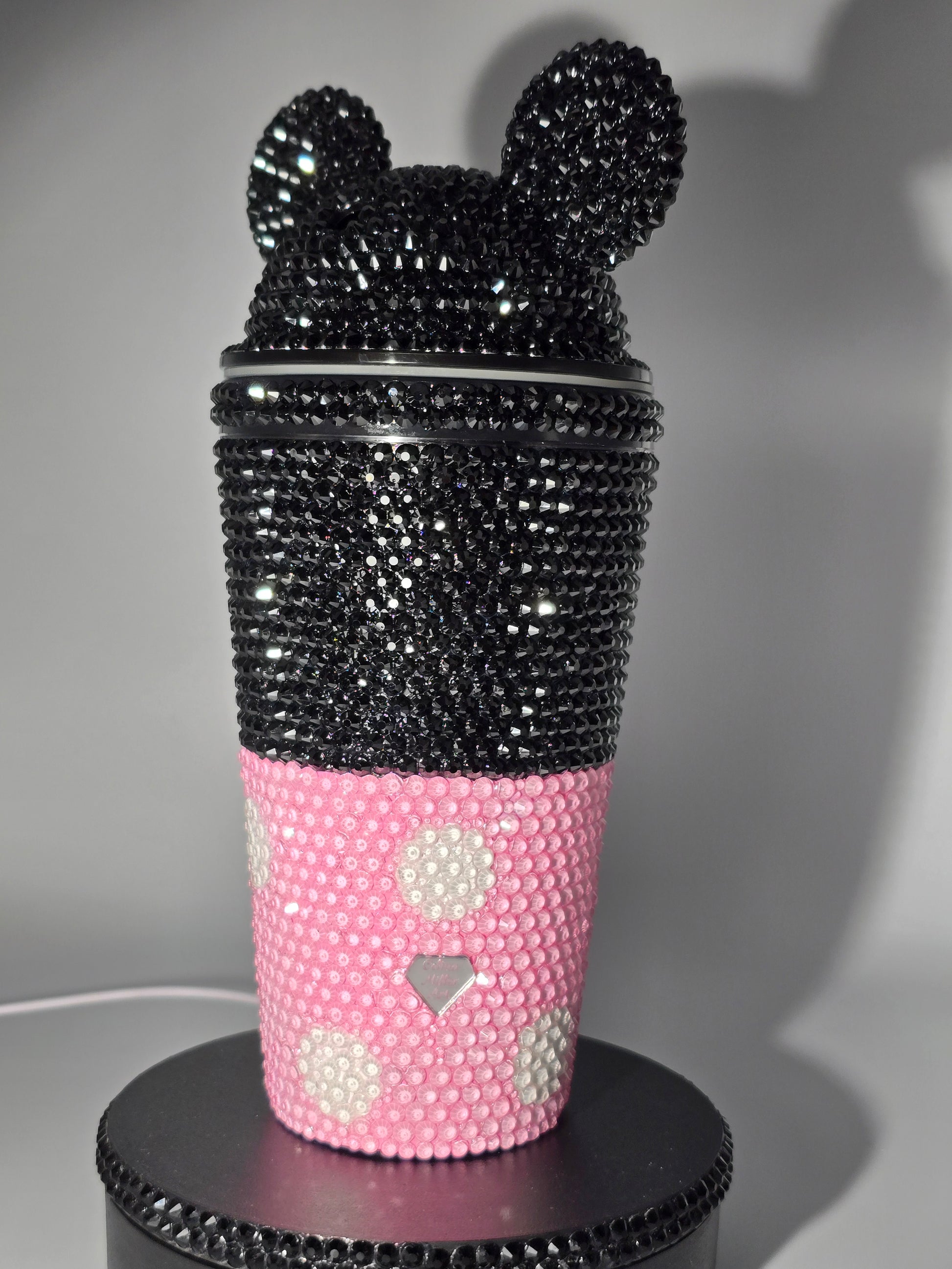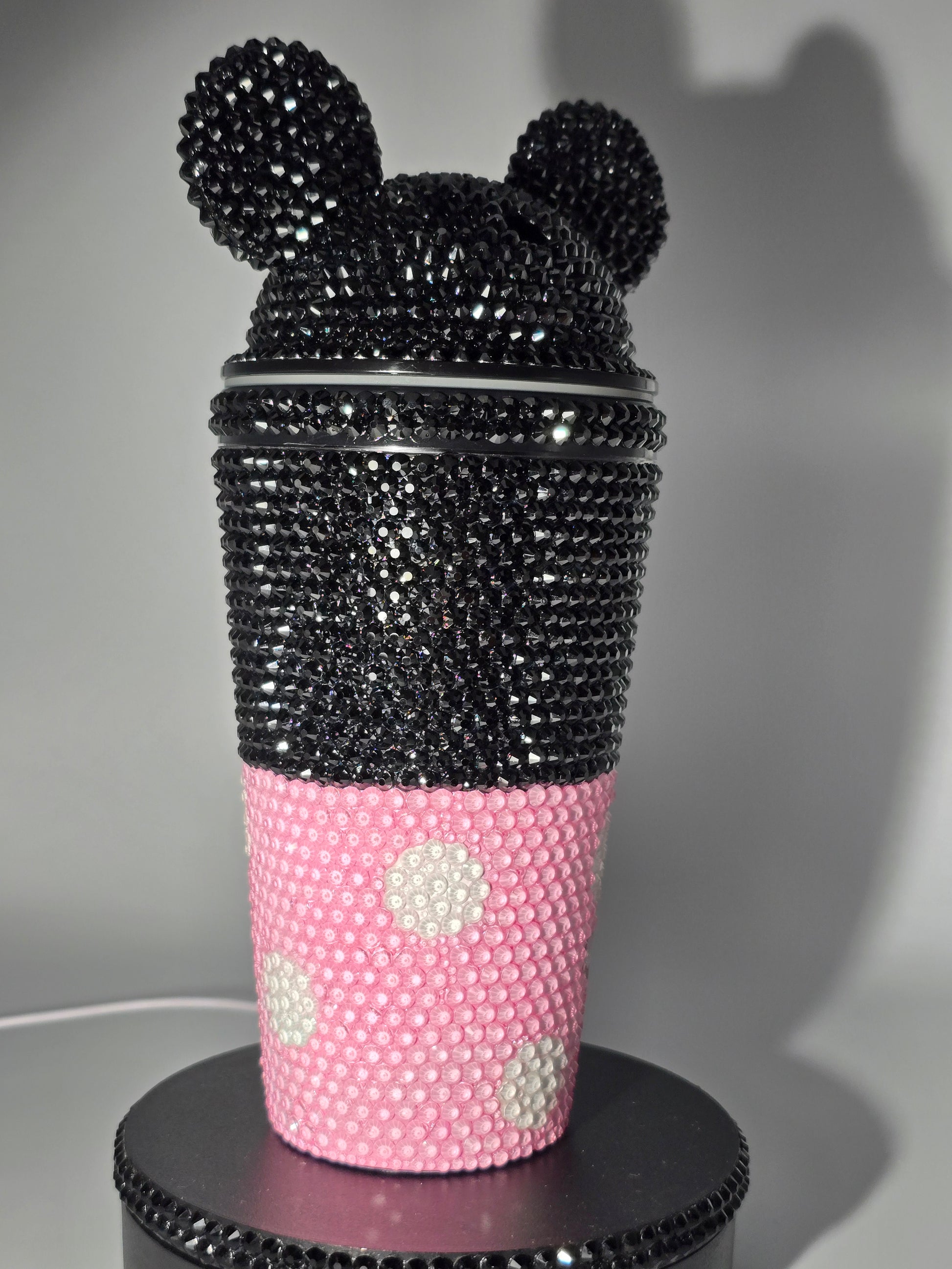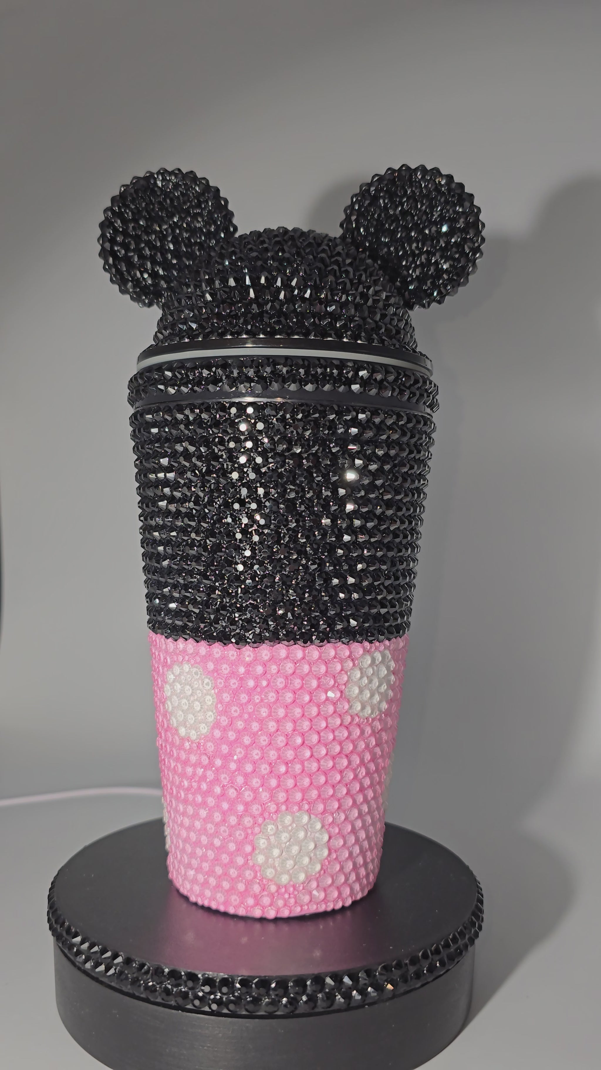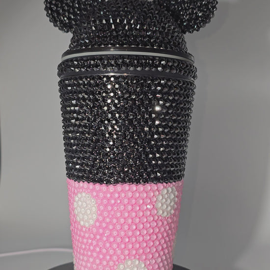 This handmade rhinestone tumbler is done on a 20 oz high-quality acrylic tumbler, full bling. Done in a high-quality colored glass rhinestones in pink mouse inspired with black background. Very durable, hand wash only, no dishwasher, no high heat exposure but this tumbler is meant for use. Good for hot and cold liquids.