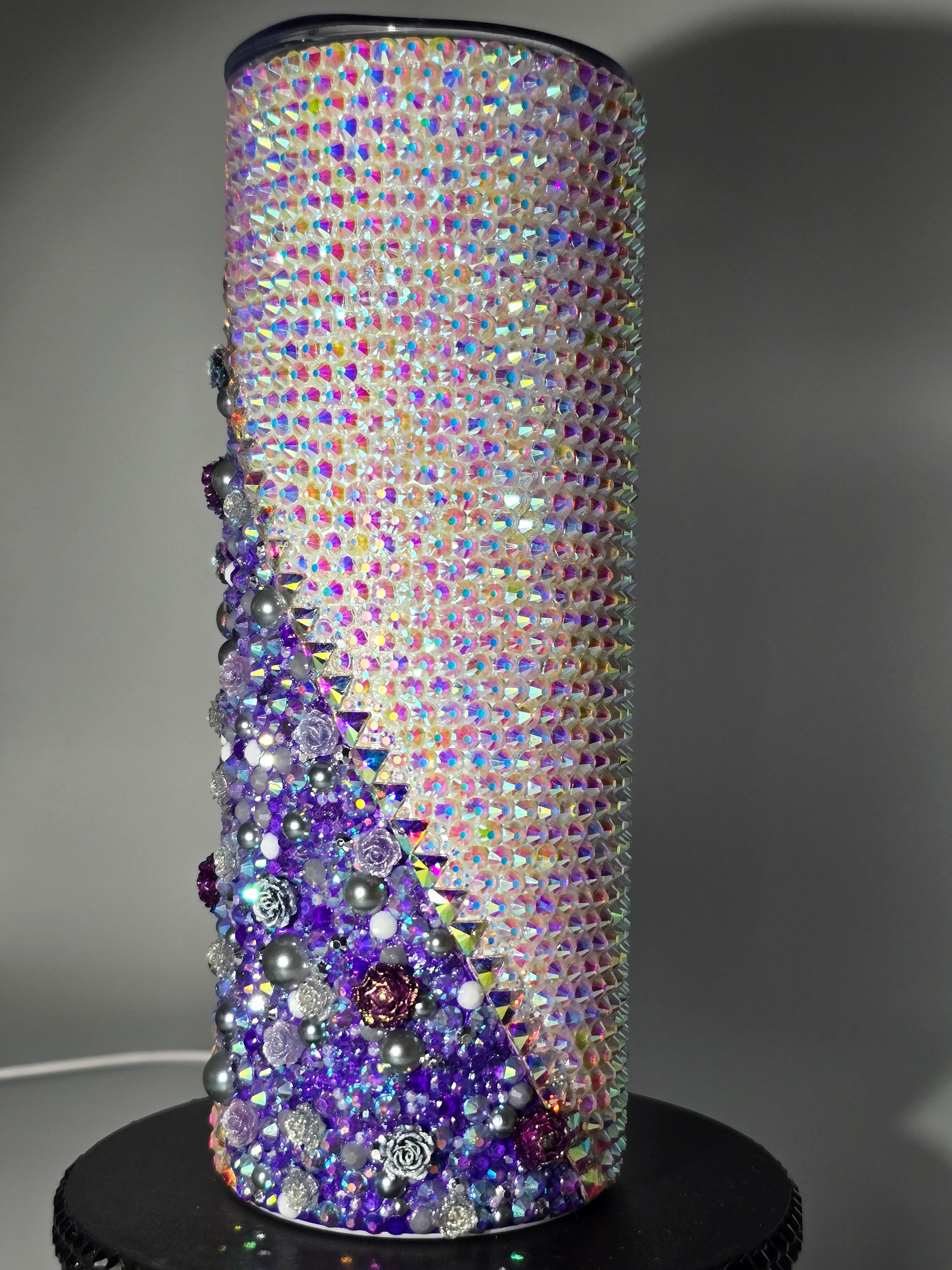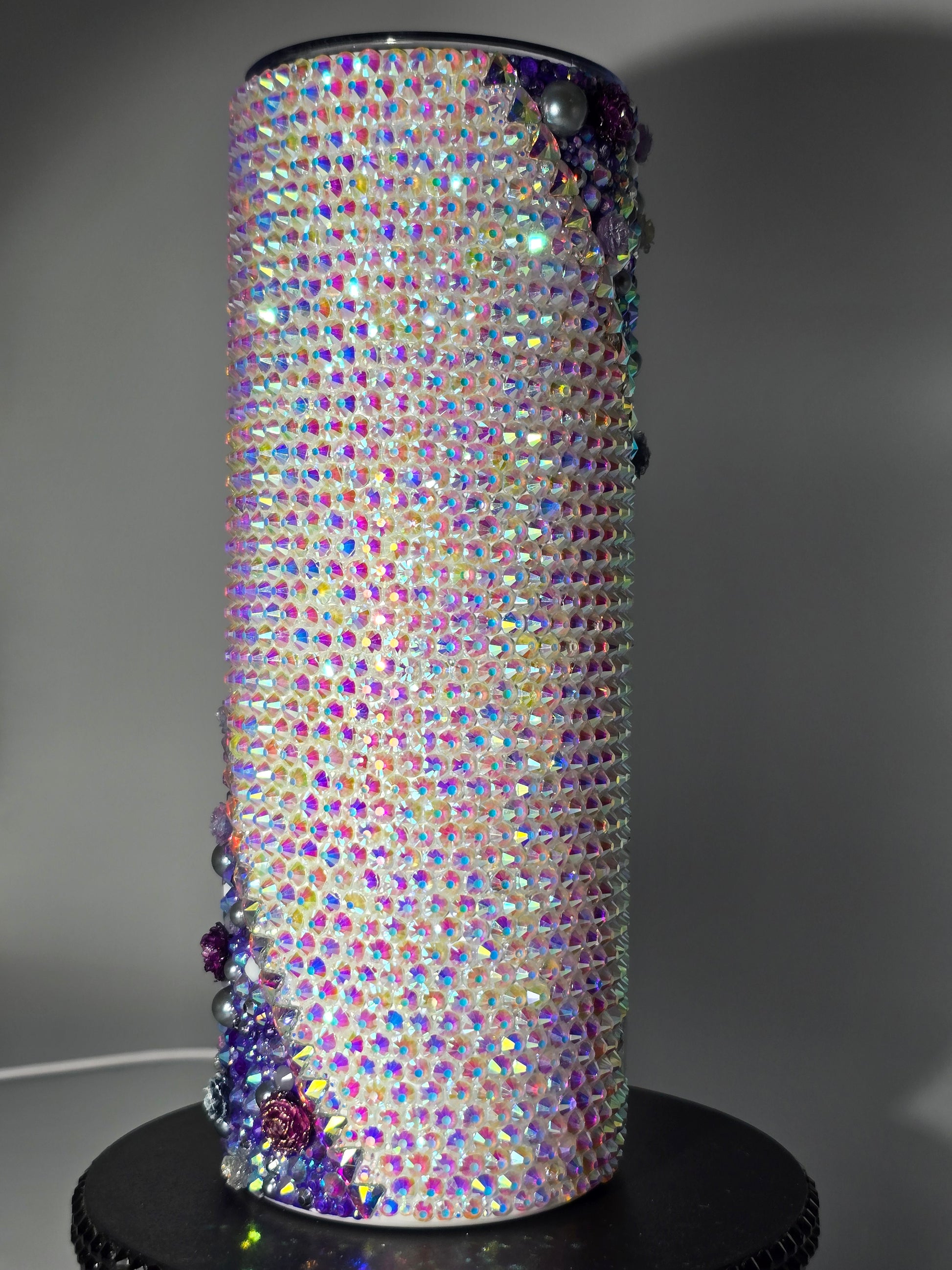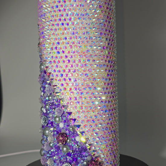 This handmade rhinestone tumbler is done on a 20 oz high-quality stainless-steel tumbler, full bling. Done in a high-quality colored glass rhinestones in purple floral with aurora borealis background. Very durable, hand wash only, no dishwasher, no high heat exposure but this tumbler is meant for use. Good for hot and cold liquids.