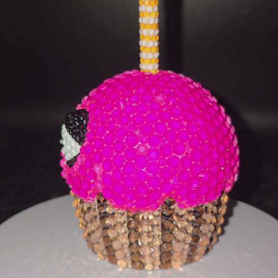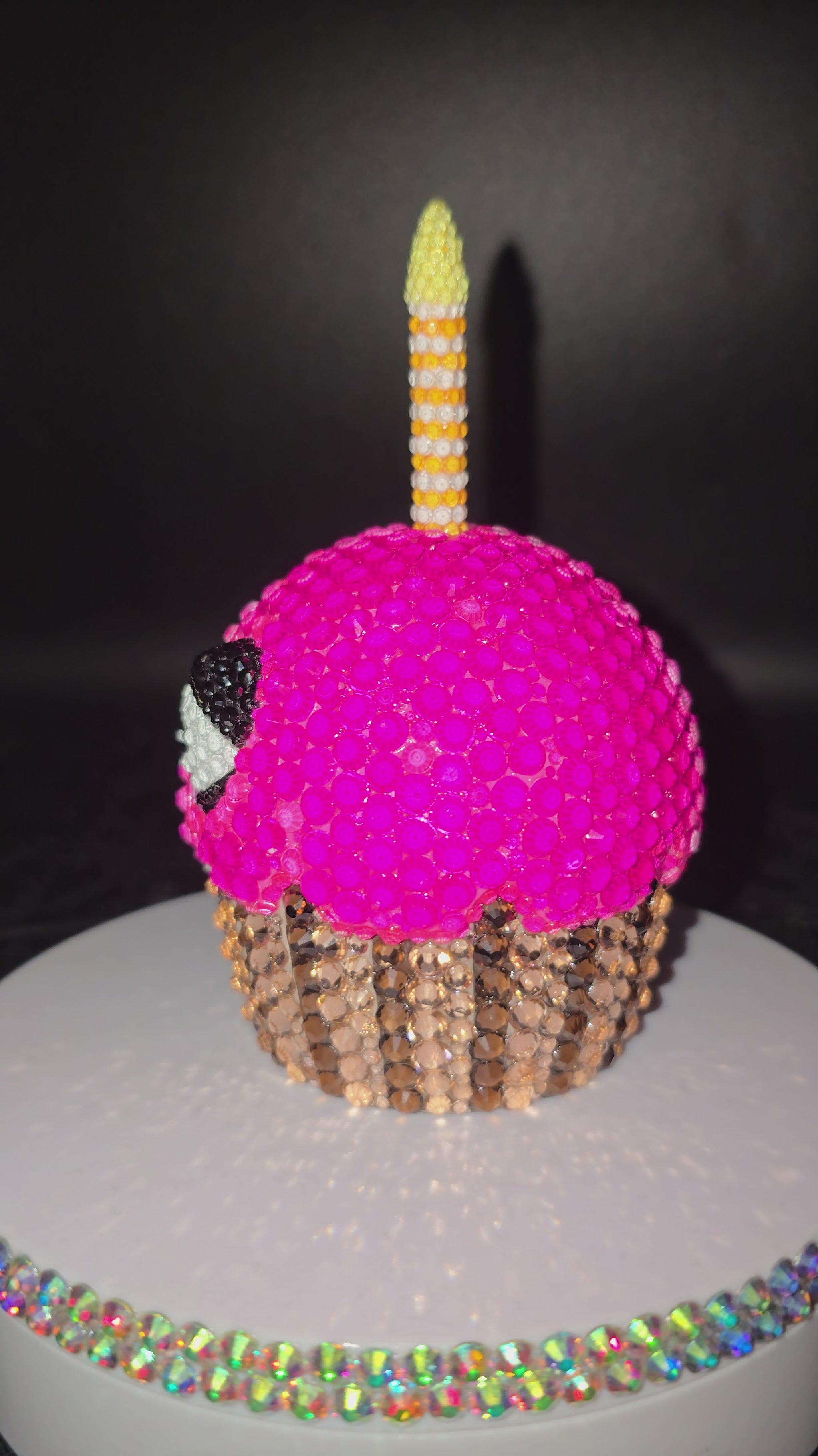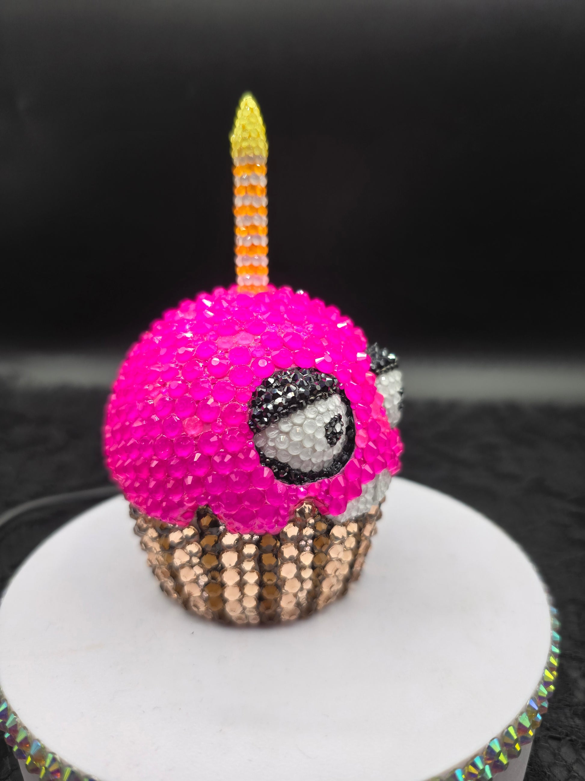 This hand made 3D printed angry cupcake was hand painted and then high quality neon pink and other glass rhinestones applied to make this gorgeous sparkling rage cupcake.