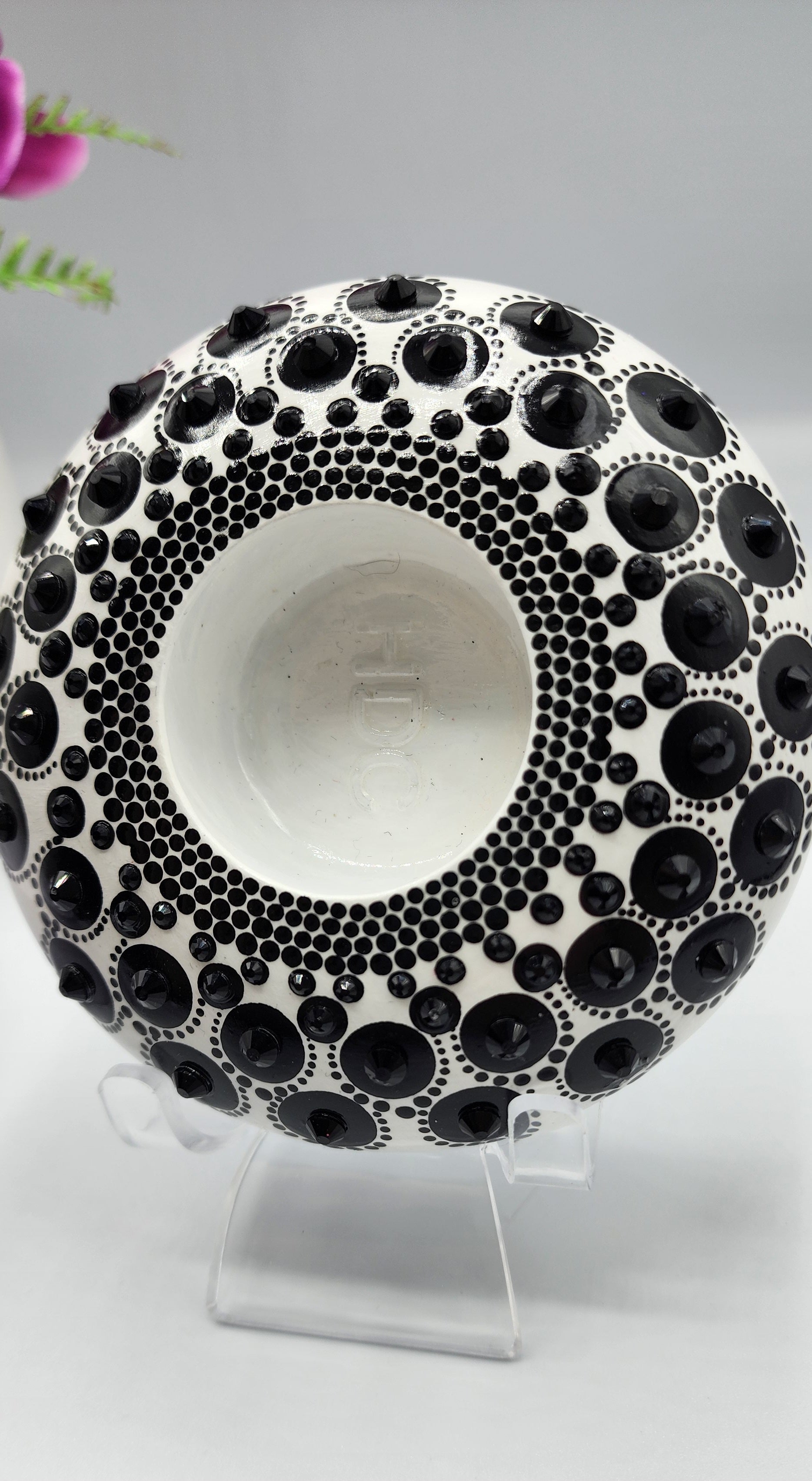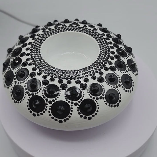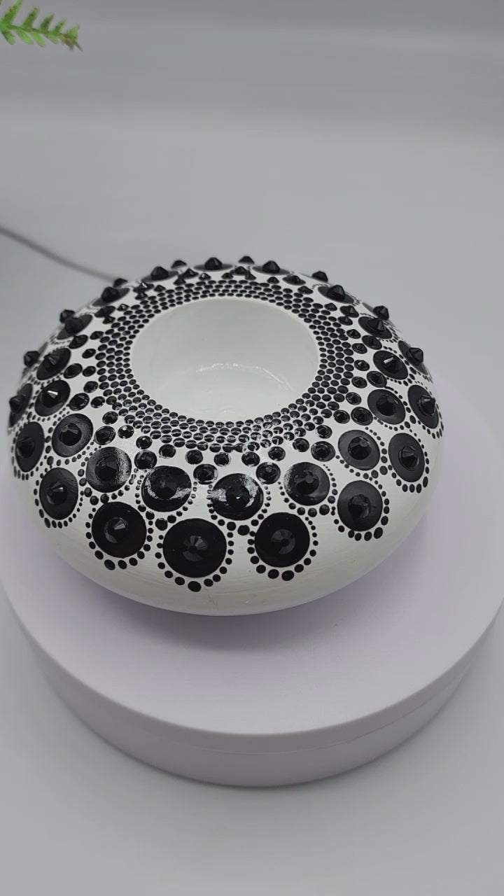 This stone is handmade, then lovingly hand painted with black on white background also has many jet black rhinestones applied, this is a TEALIGHT CANDLE HOLDER. Tealight not included.