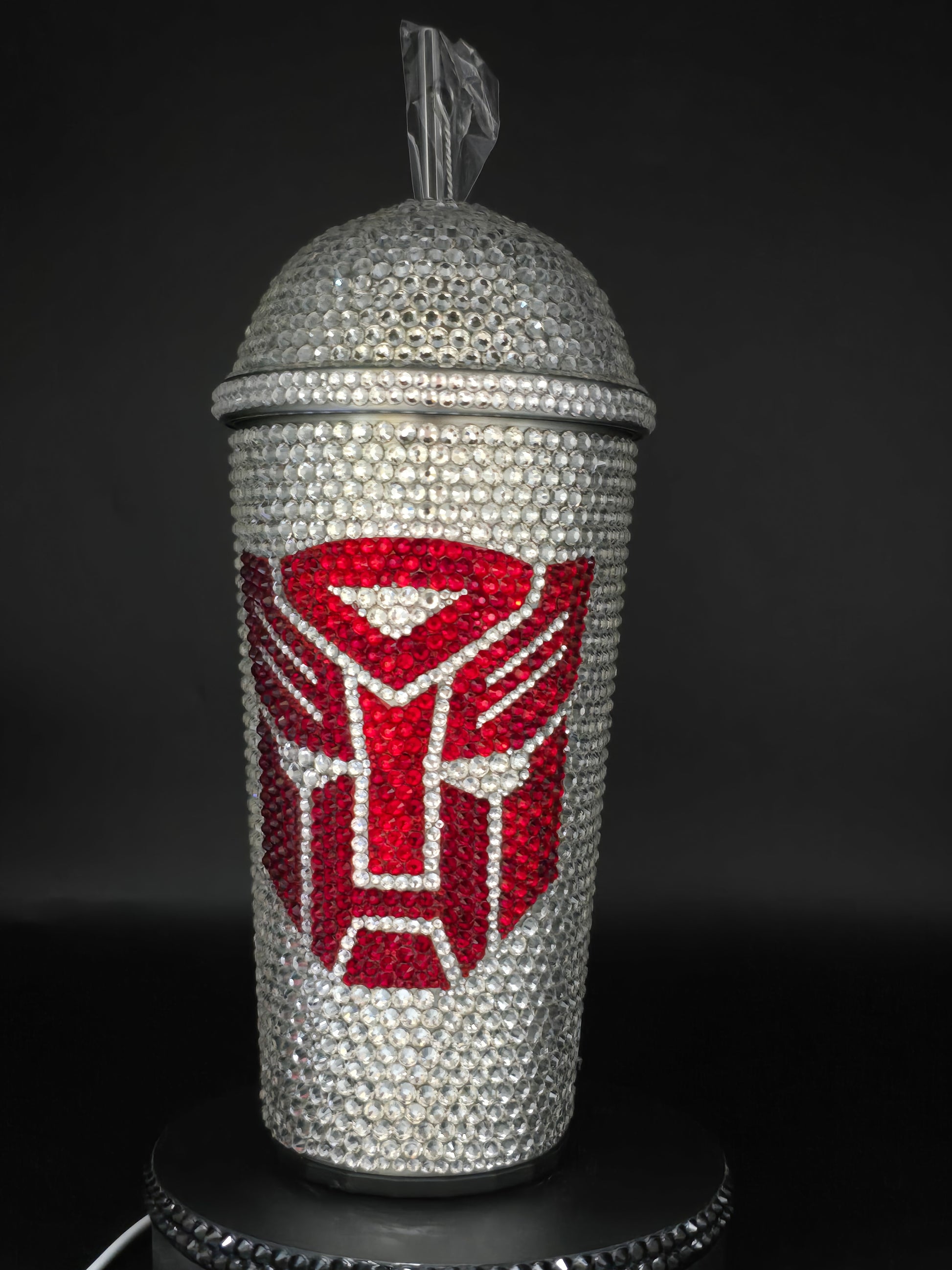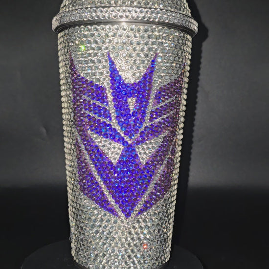 This hand made rhinestone tumbler is done on a 20 oz high quality stainless steel tumbler, full bling. Done in a high quality coloured glass rhinestones in silver, red and purple. Double sided design, one side is Decepticons and the other is Autobots.