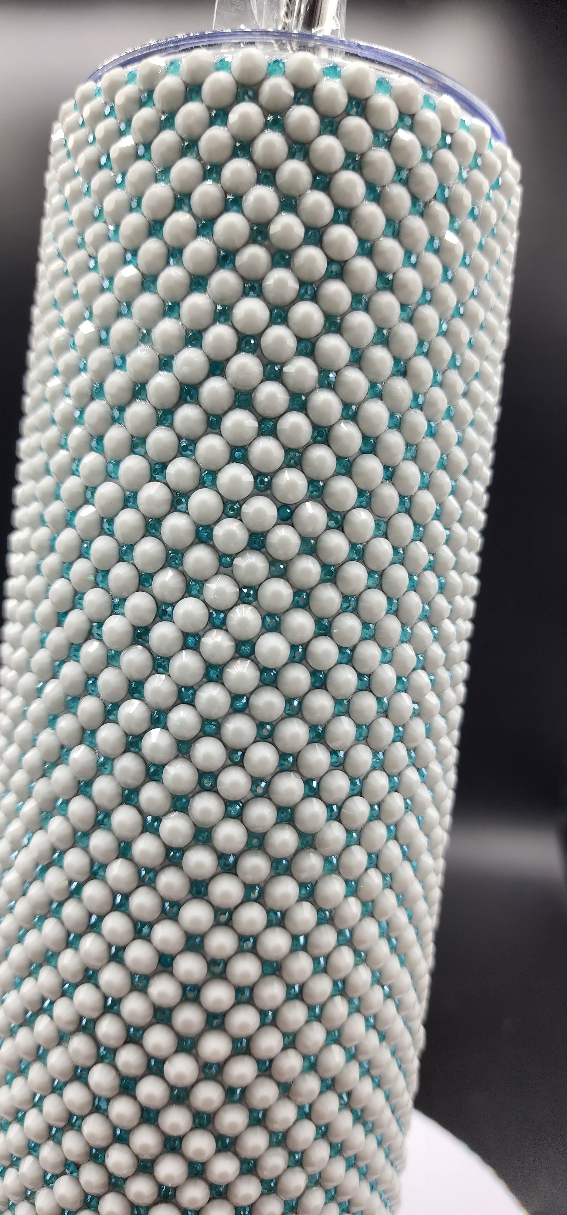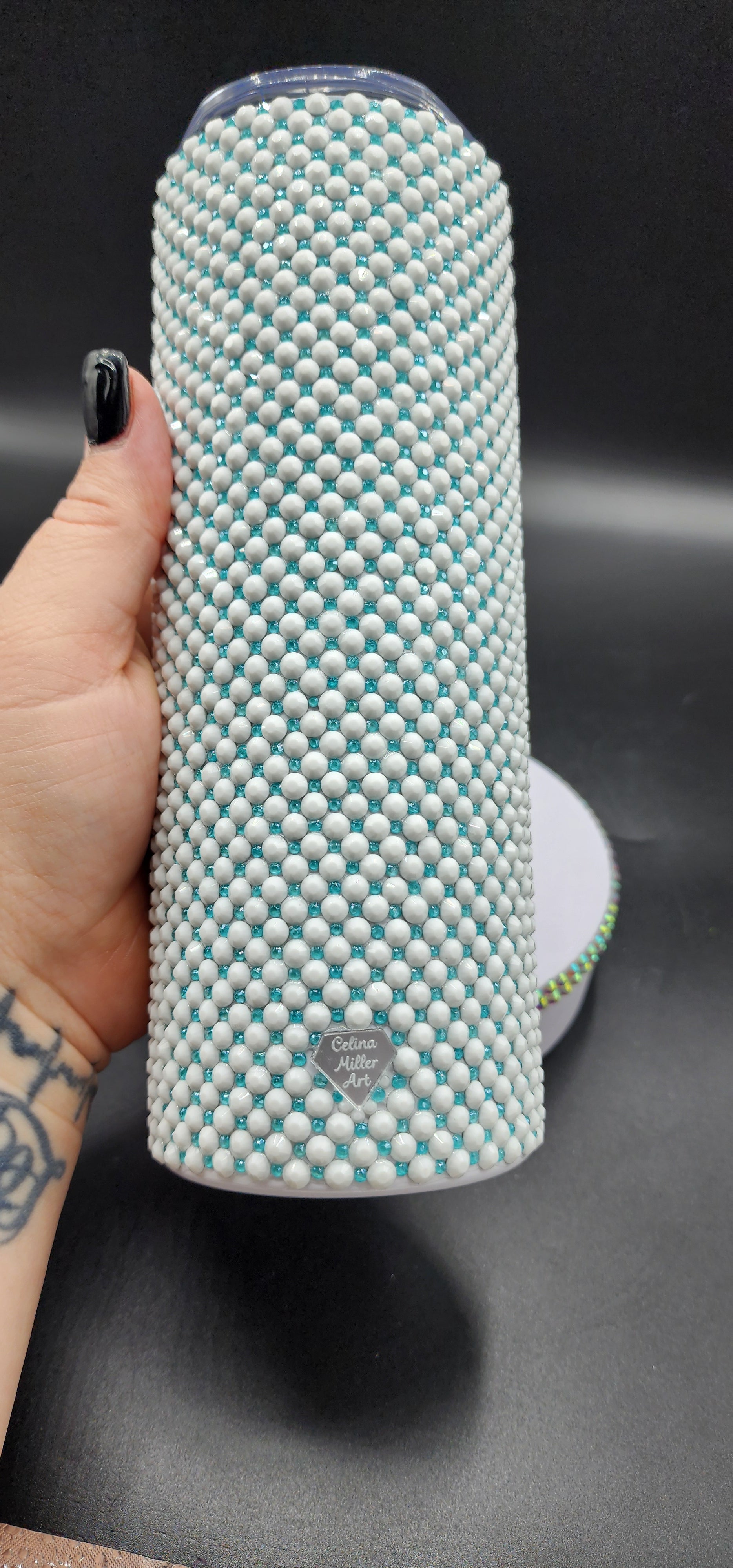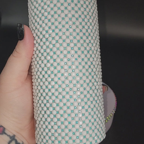 This hand made rhinestone tumbler is done on a 20 oz high quality stainless steel tumbler, full bling. Done in a high quality coloured glass rhinestones in white and teal. Very durable, hand wash only, no dishwasher, no high heat exposure but this tumbler is meant for use. Good for hot and cold liquids.