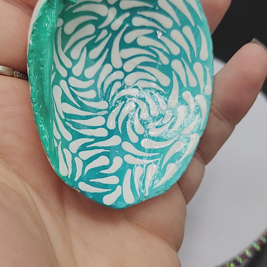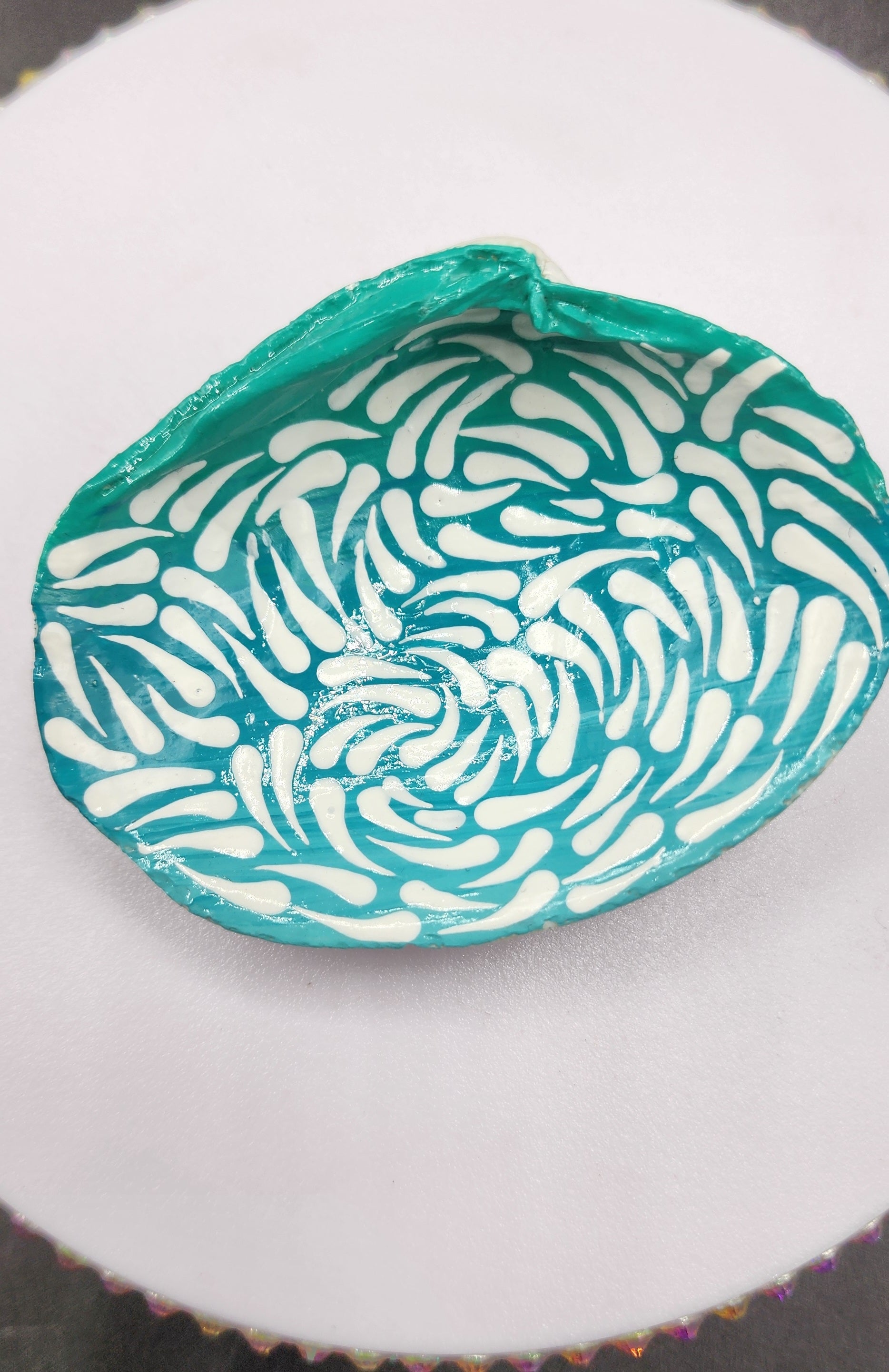 This is painted on a hand collected sea shell from the Pacific Ocean off of Vancouver Island, this one is painted with a teal background with swooshes.