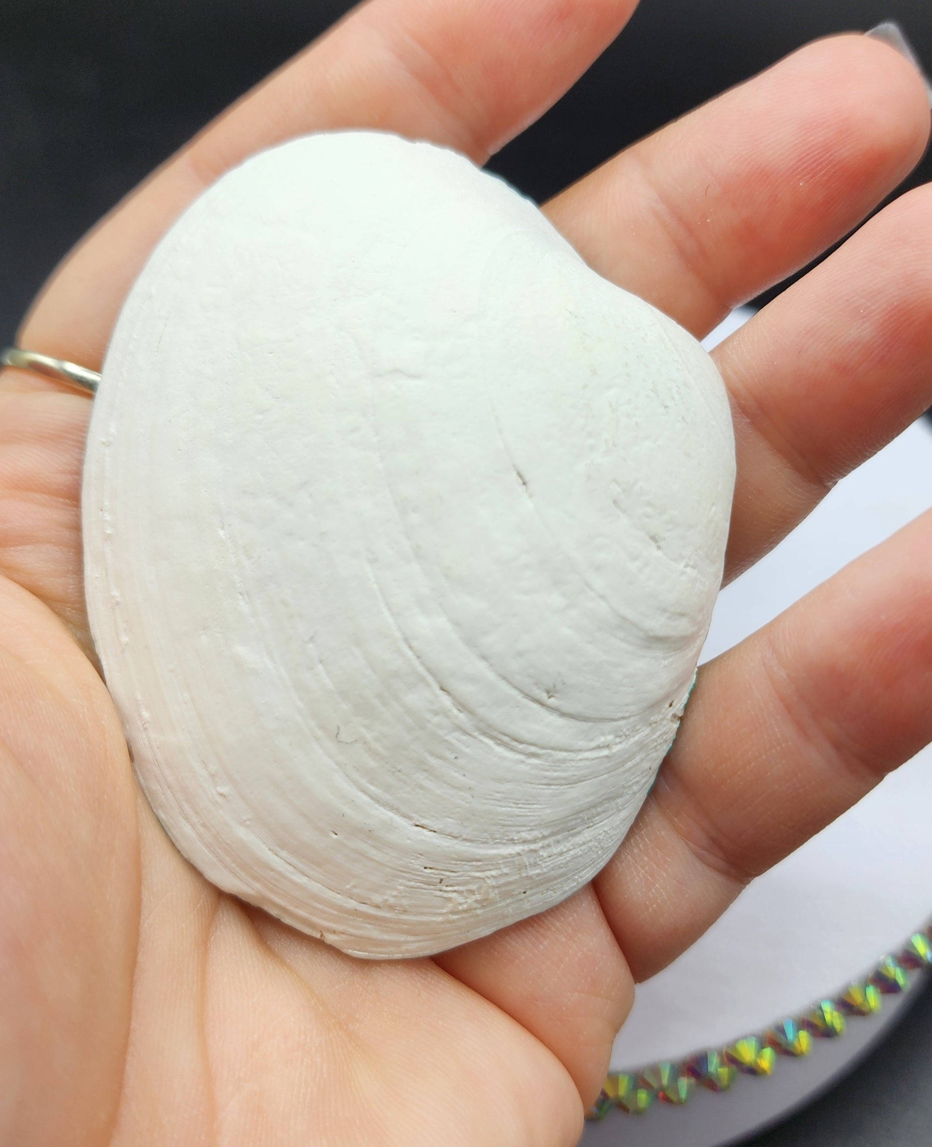 This sea shell is approximately 3.5 inches long by 2.6 inches across,