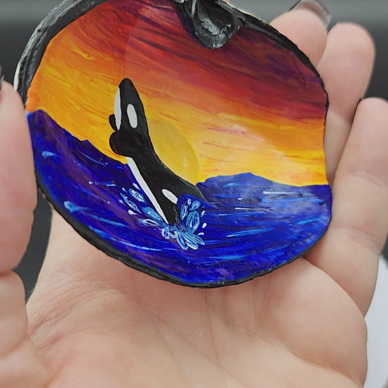 This is painted on a hand collected sea shell from the Pacific Ocean off of Vancouver Island, this one is painted with a sunset and a breaching orca jumping from the ocean.