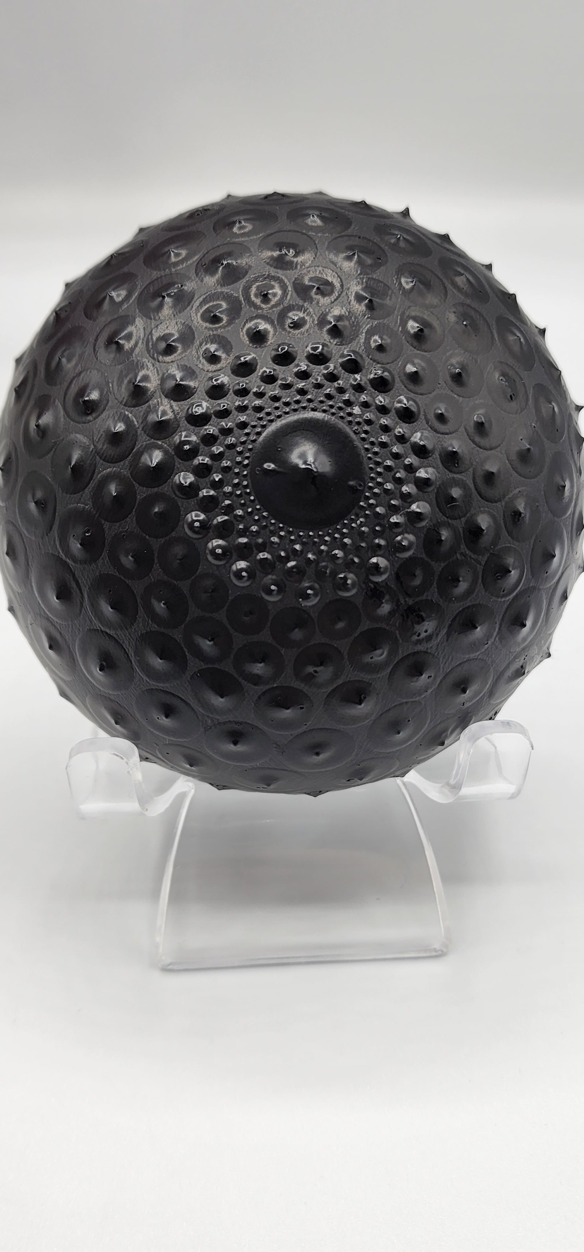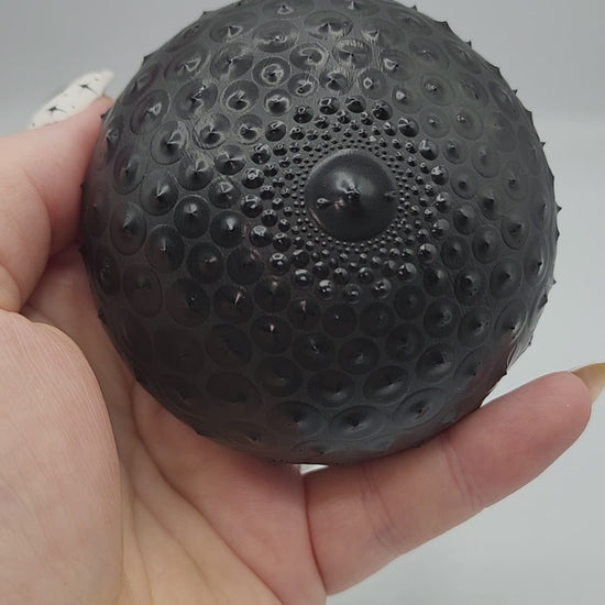 This stone was painted with the wonderful mandala design of sacred geometry with a matte black background and a glossy black dots on top.