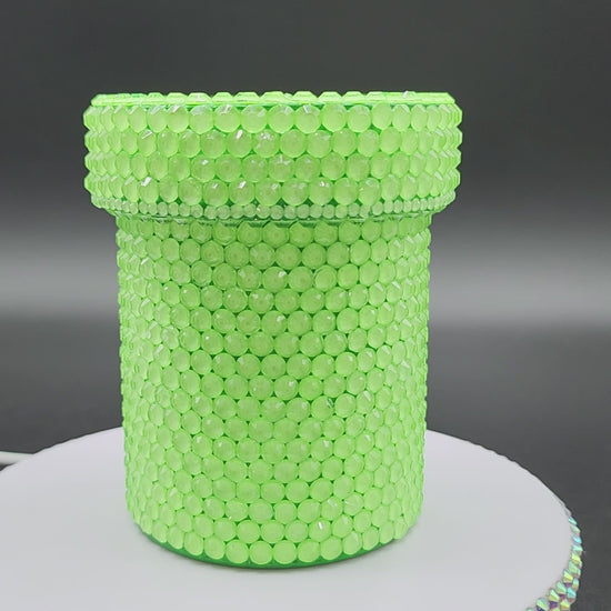 This hand made 3D printed warp pipe, reminiscent of video games, this can be used to hold pens, scissors or any other office supplies, you can put flowers in it, or just use as decoration. For any video game lover. Hand painted and then high quality glass rhinestones applied.